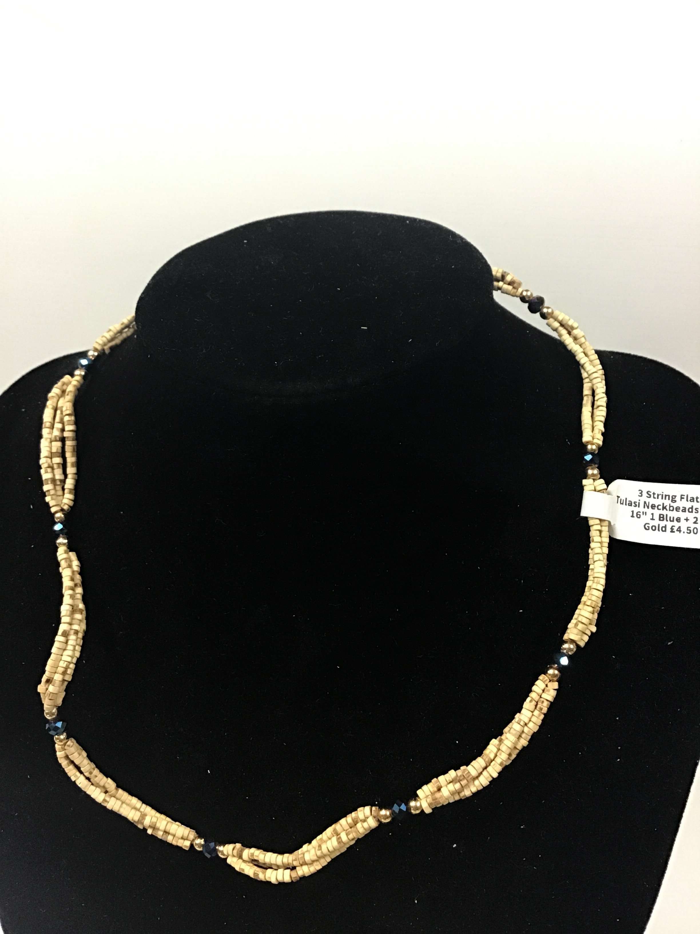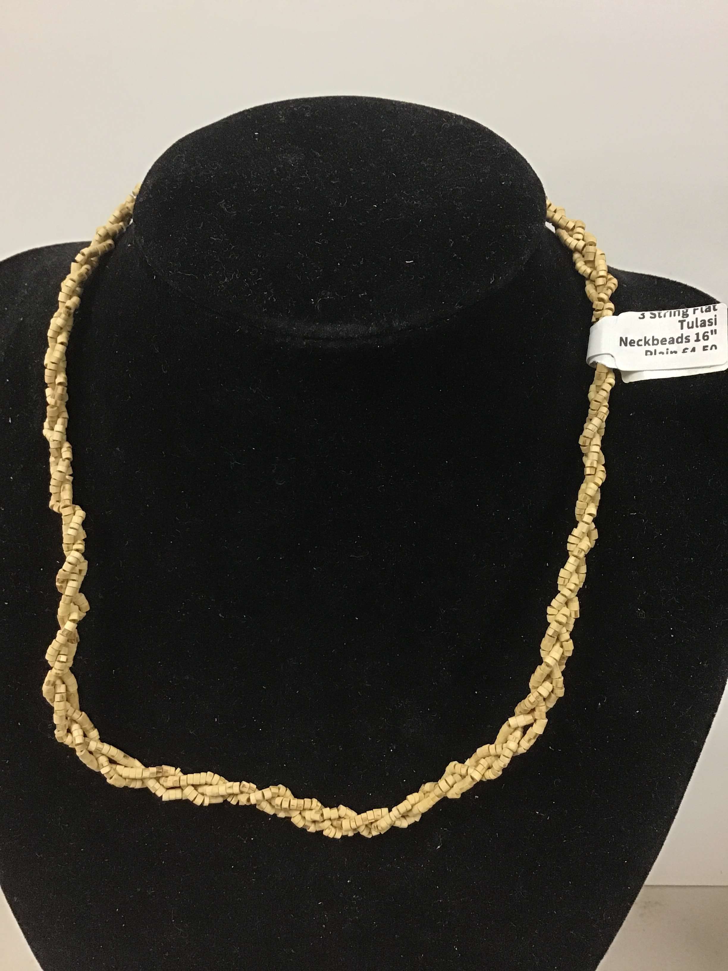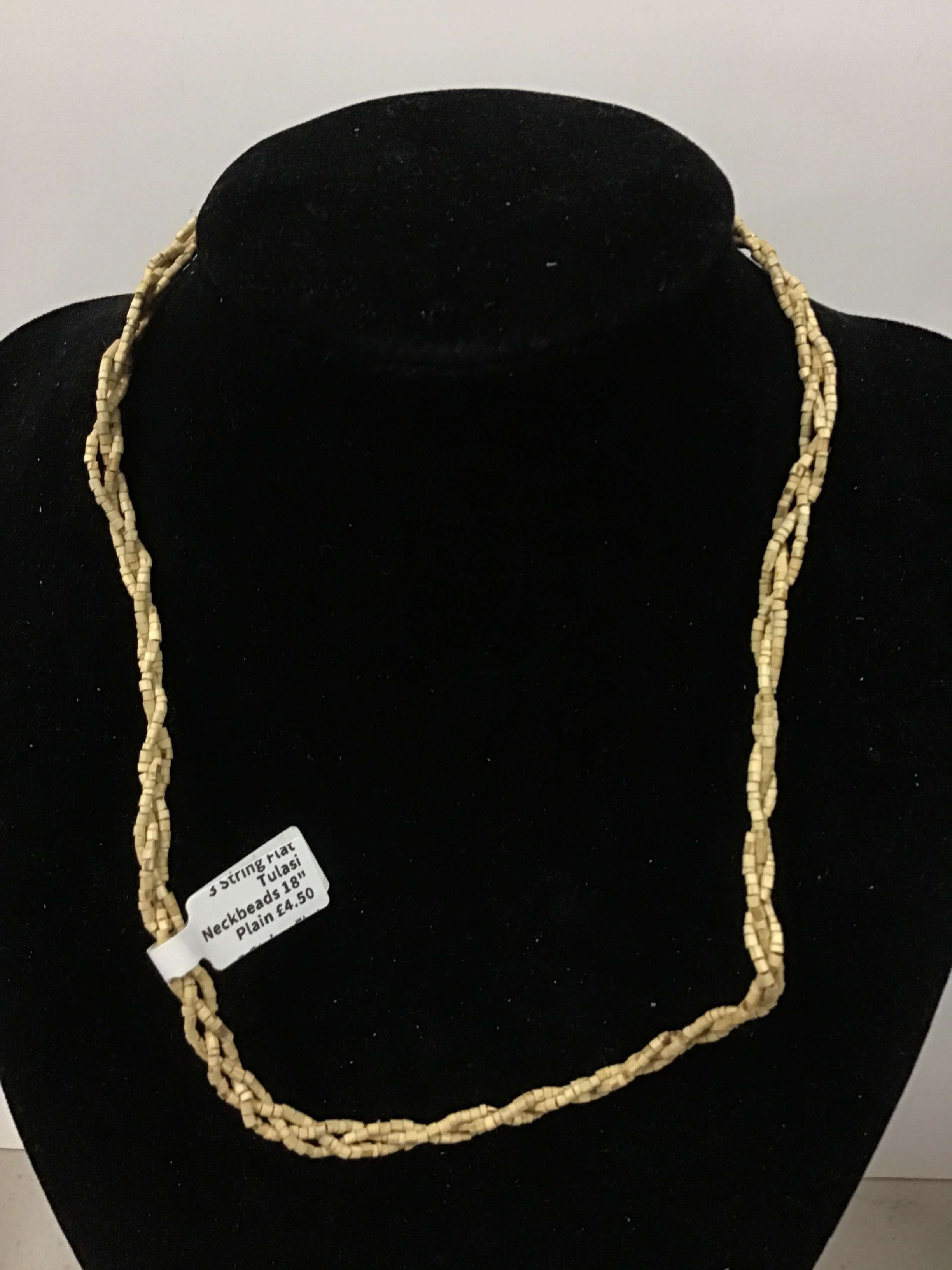 Necklace (kanthi mala) made of 3 strands of 2mm x 1mm Tulasi beads with flat ends. This style comes in plain or with one/three beads of similar size (made of another material) threaded onto the necklace approximately every 1.25". The length of the necklaces are either 16" or 18" from end to end.