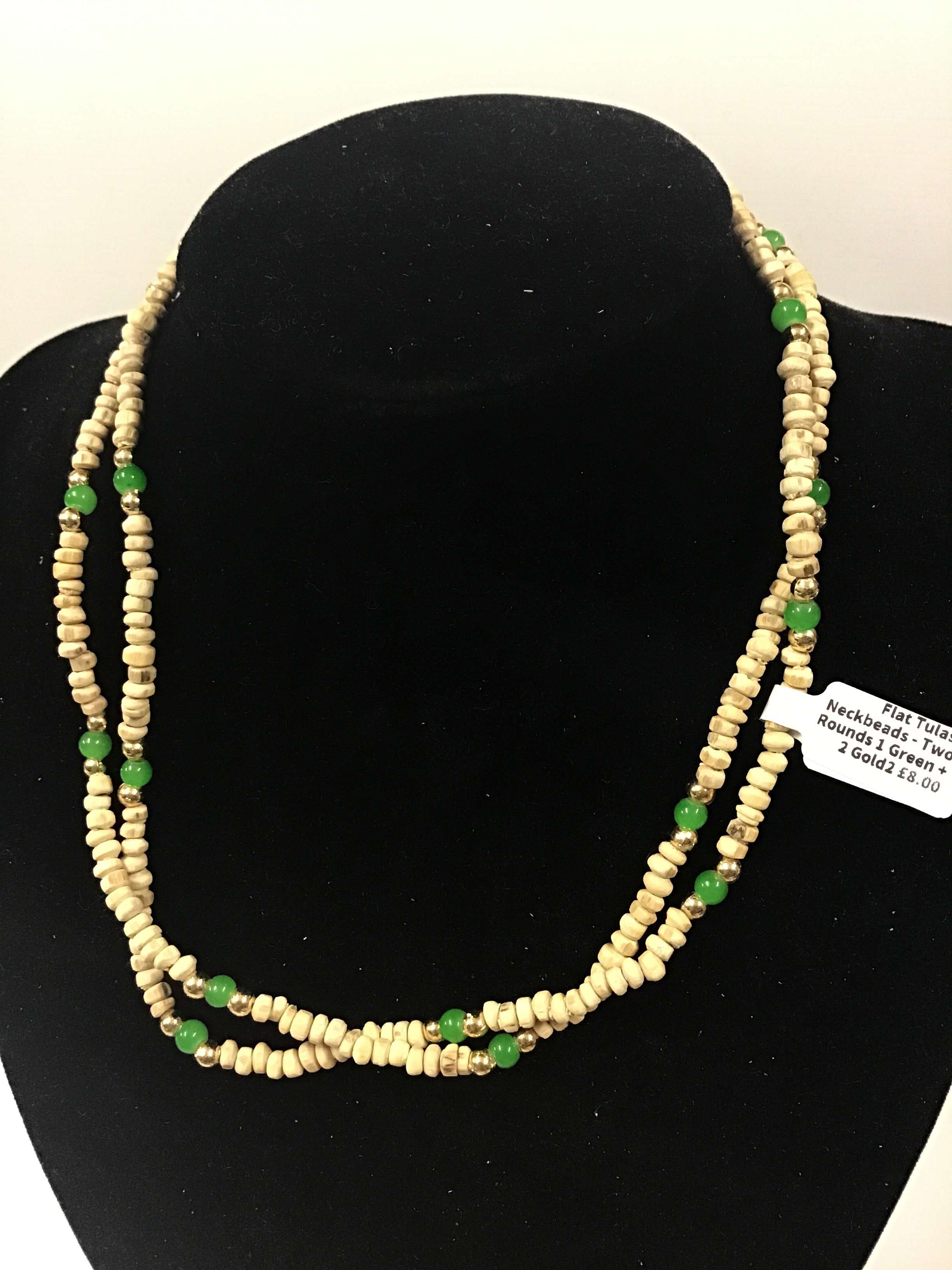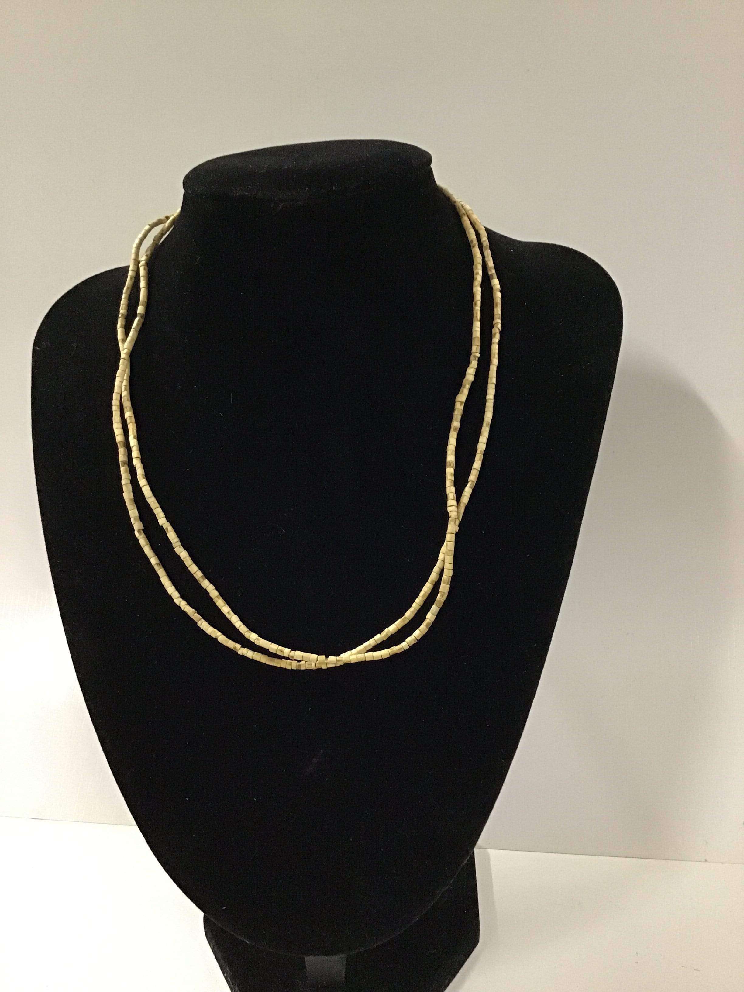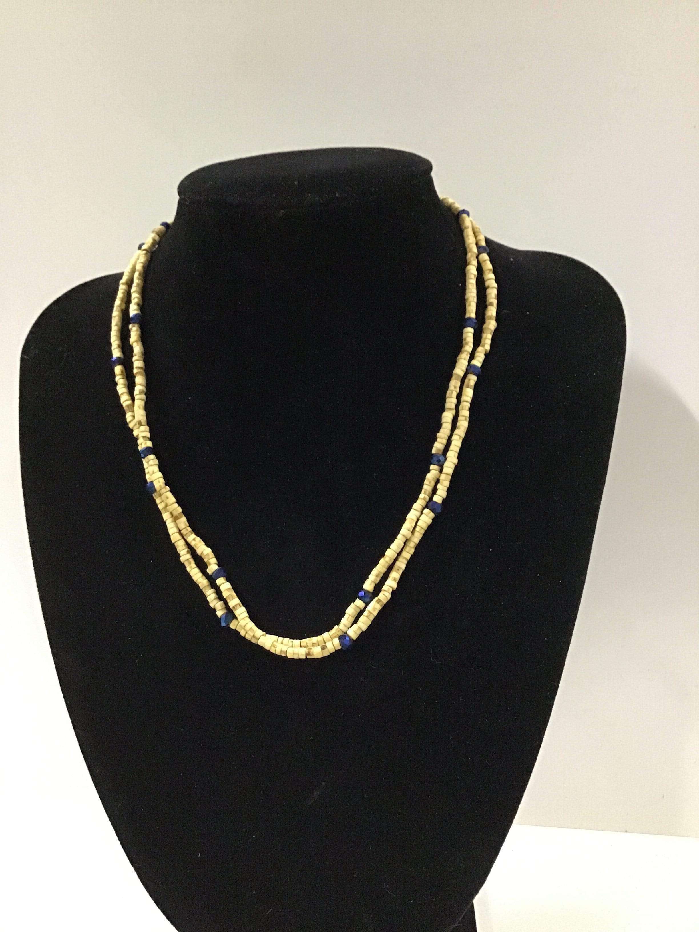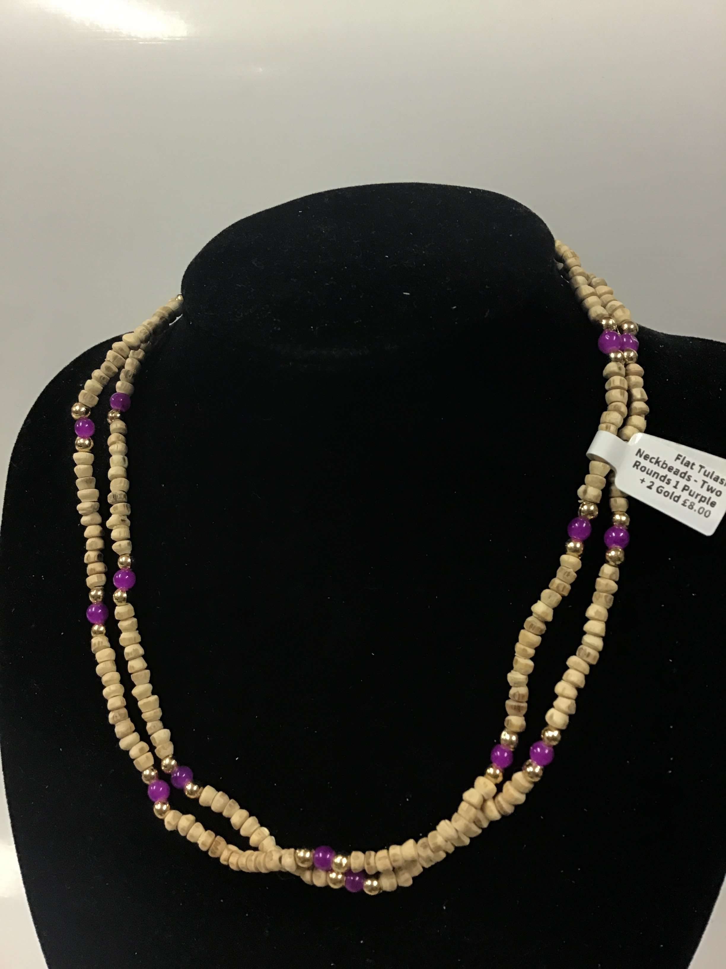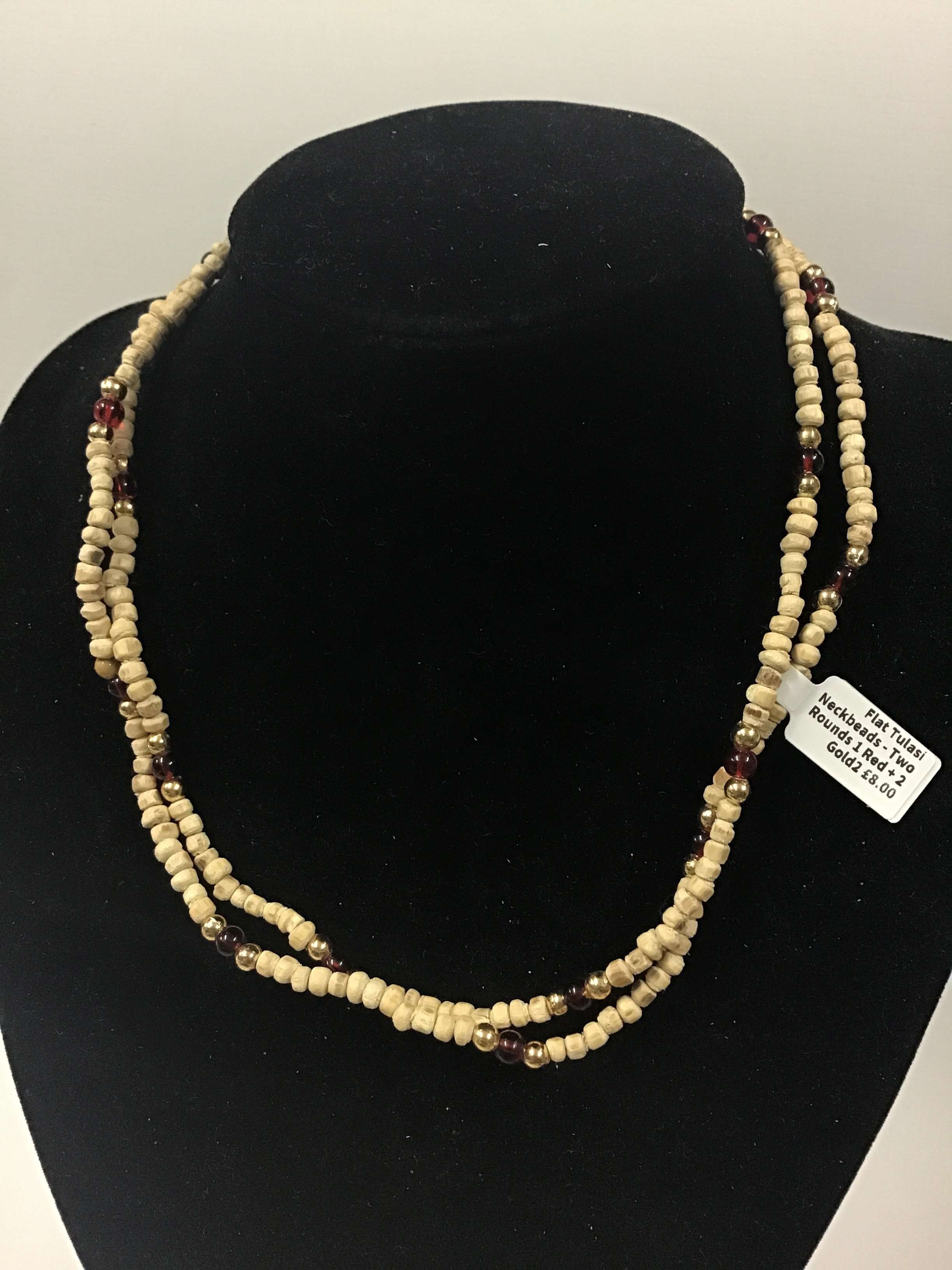 Necklace (kanthi mala) made of 3mm x 2mm Tulasi beads with flat ends. This style comes in plain or with one/three beads of similar size (made of another material) threaded onto the necklace approximately every 5-20 beads, depending on style. The length of the necklace is 18" from end to end when undone.