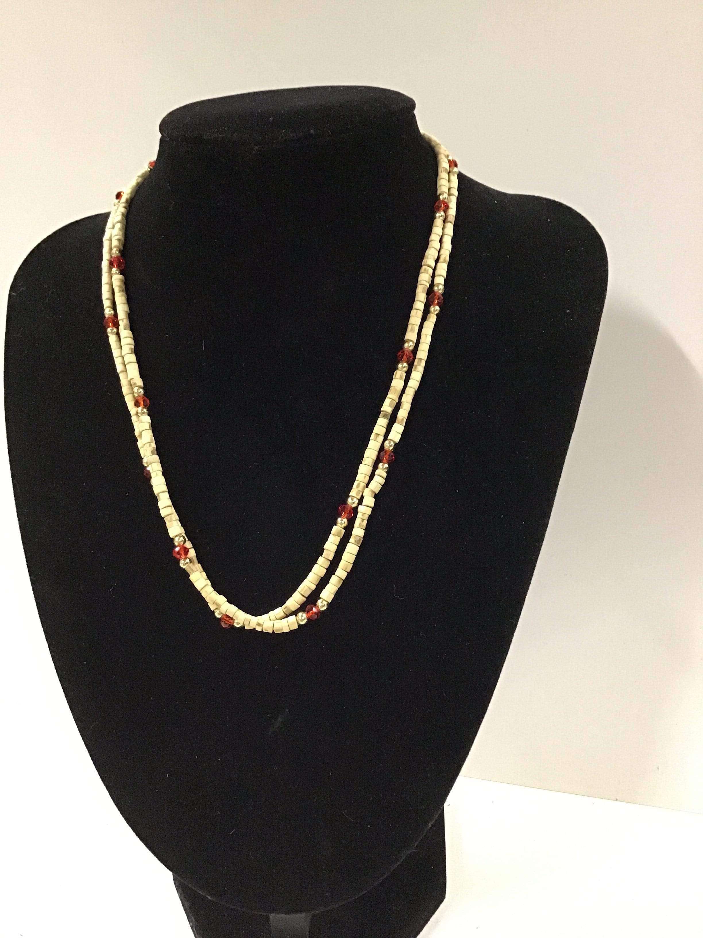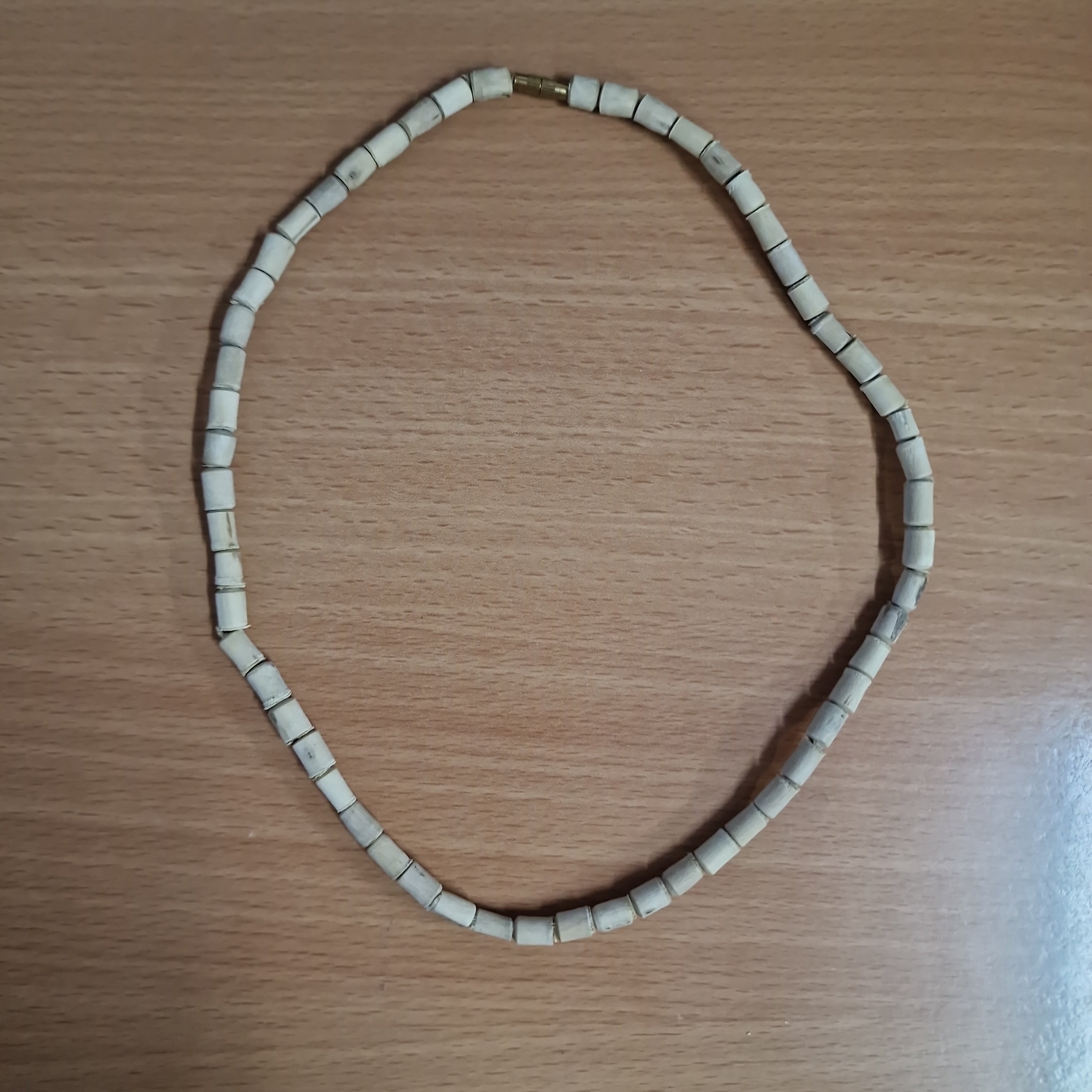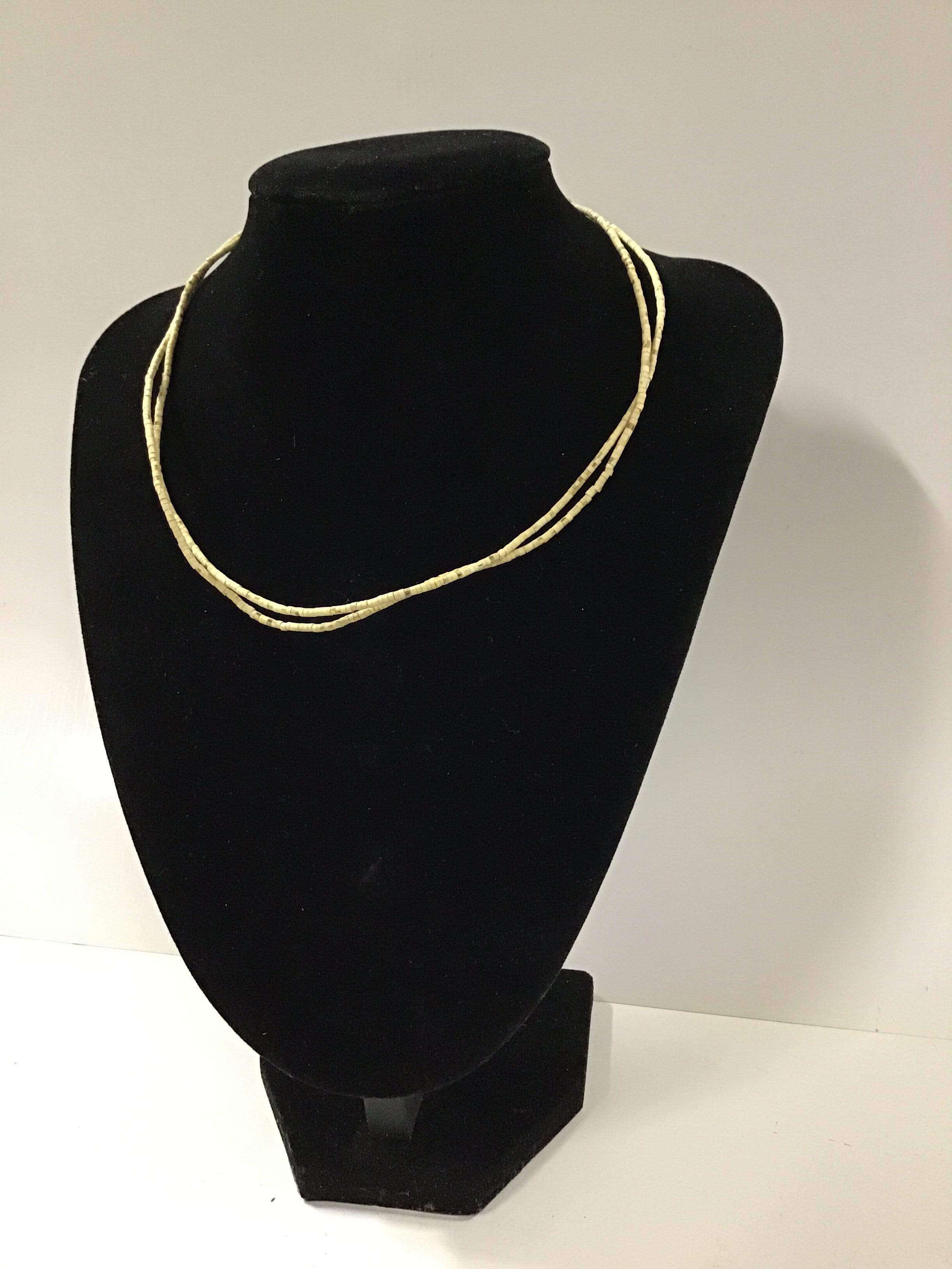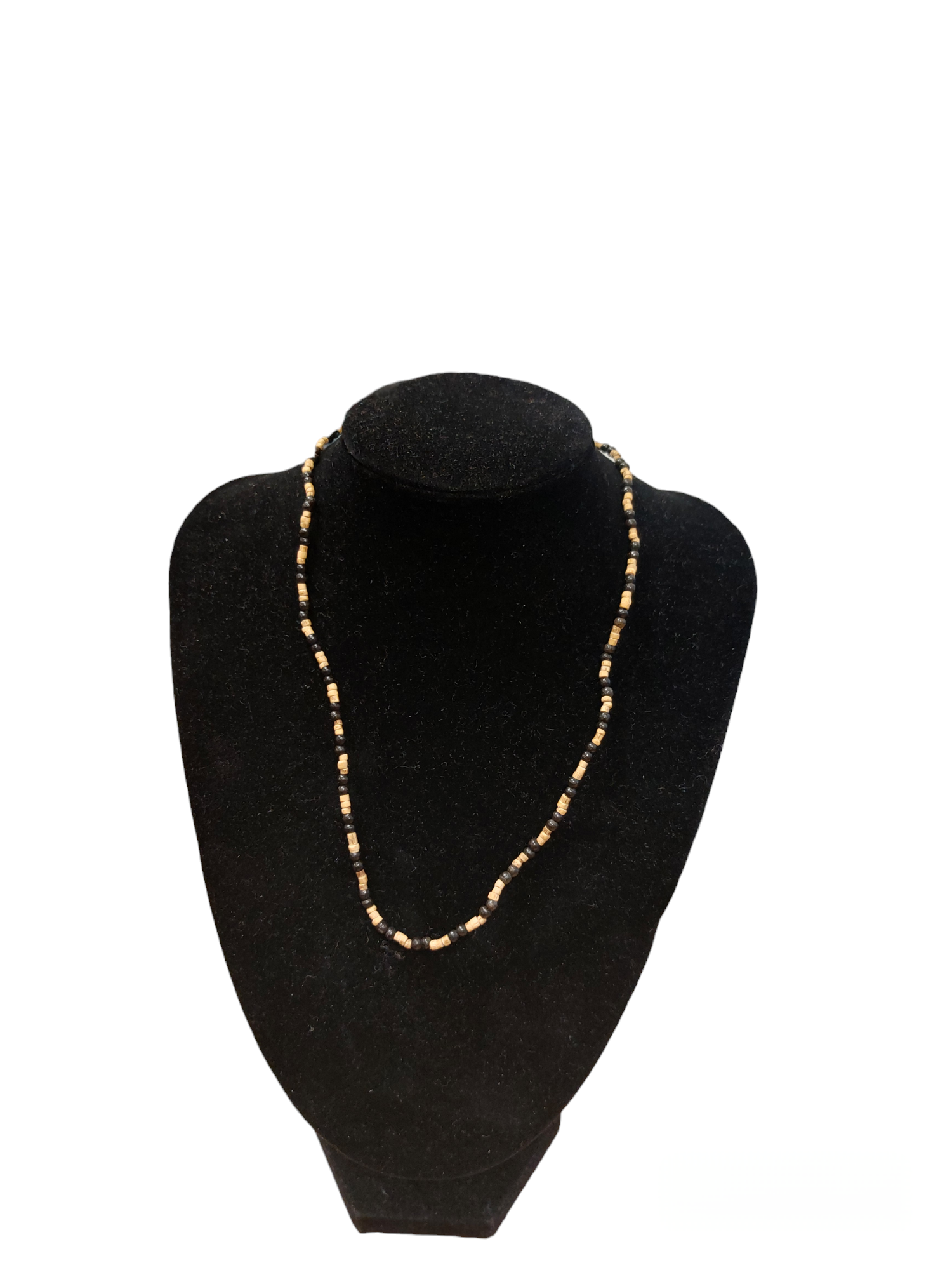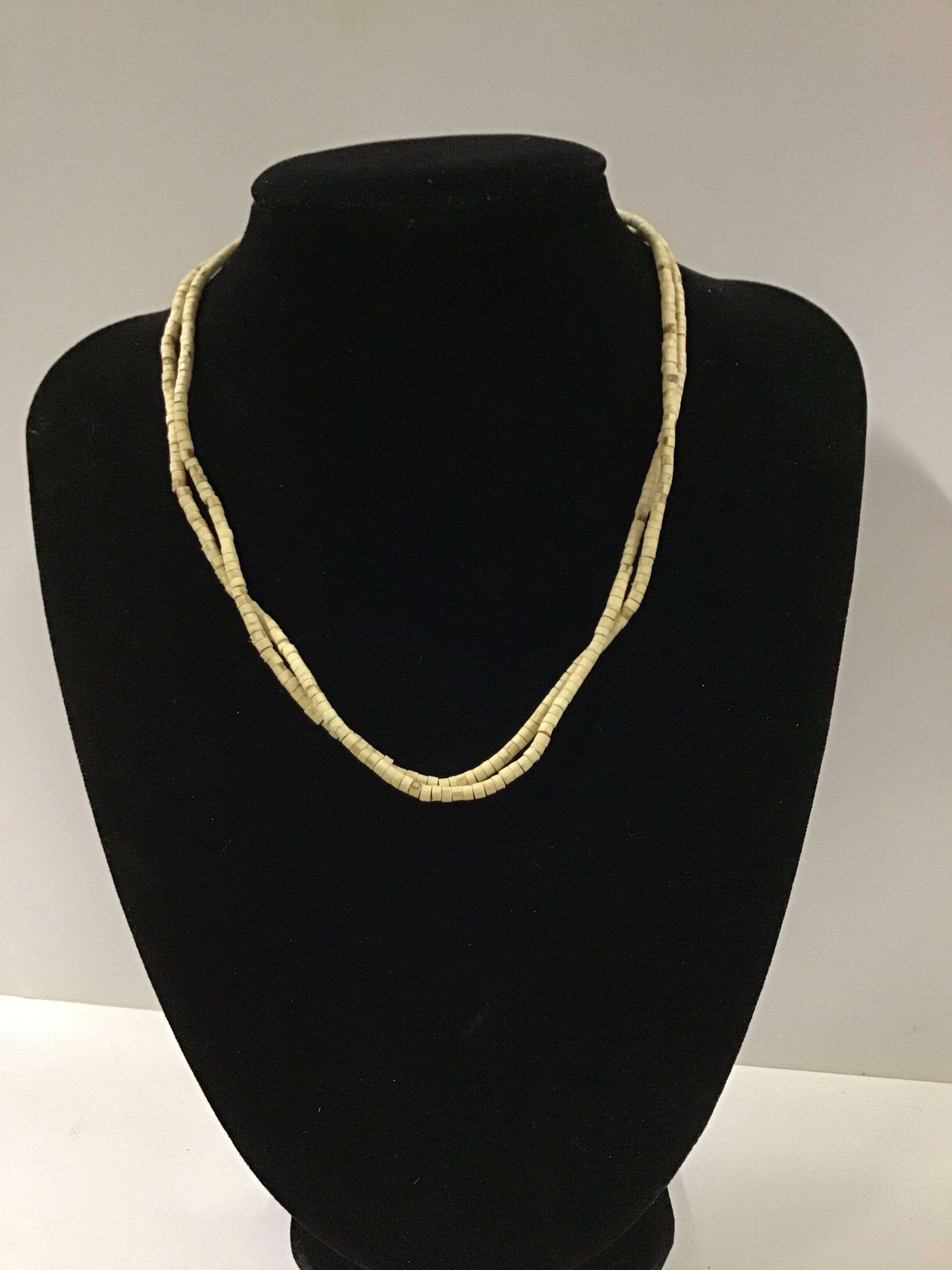 Necklace (kanthi mala) made of 3mm x 2mm Tulasi beads with flat ends. This style comes in plain or with one/three beads of similar size (made of another material) threaded onto the necklace approximately every 5-20 beads, depending on style. The length of the necklace is 18" from end to end when undone.