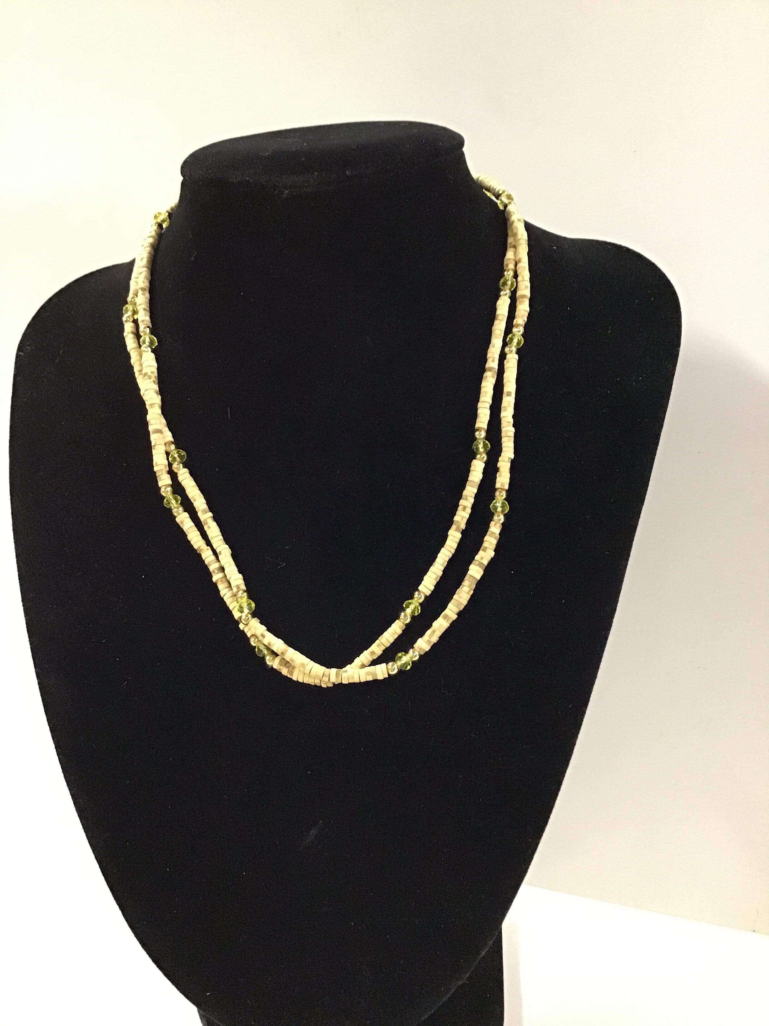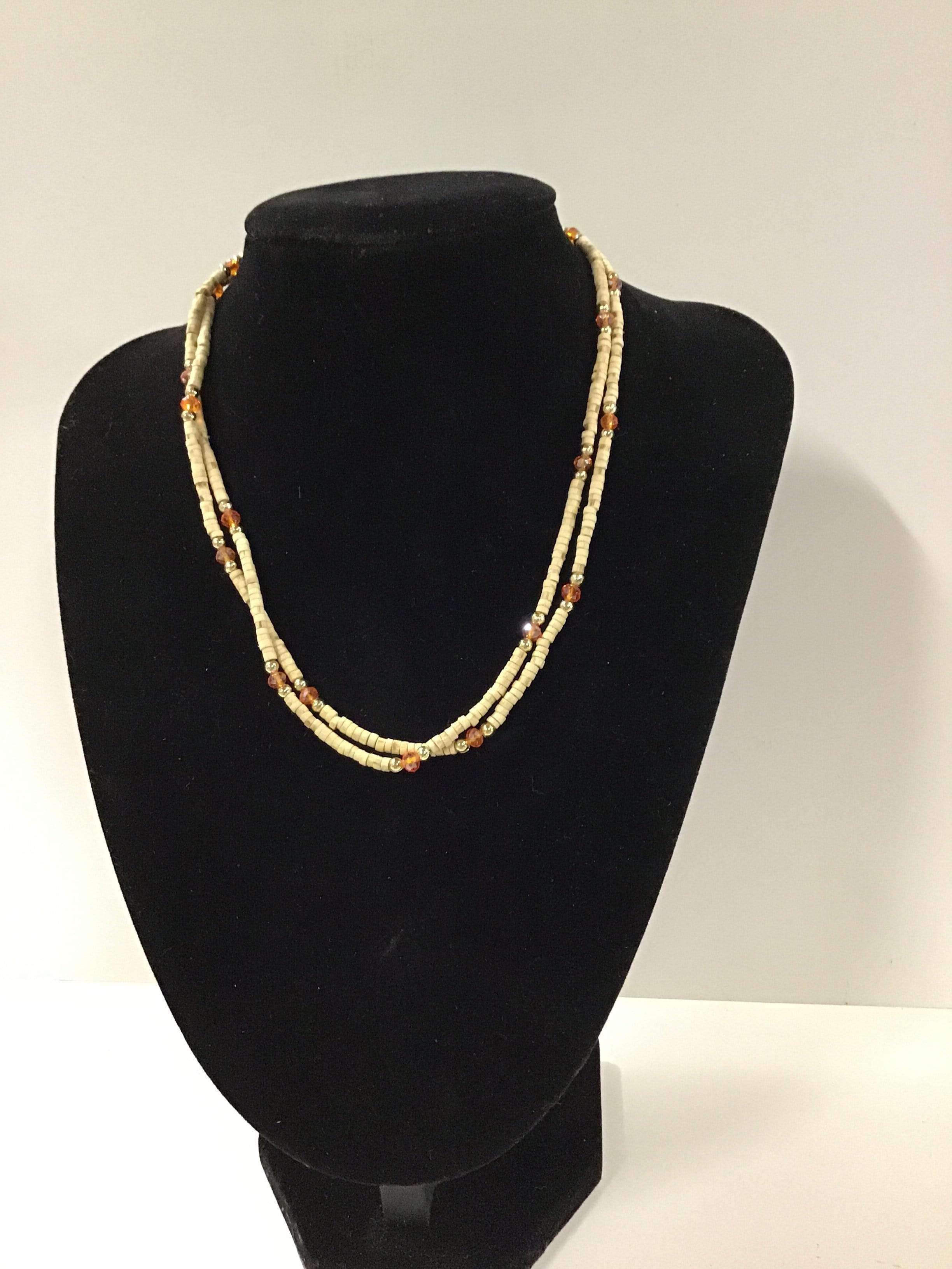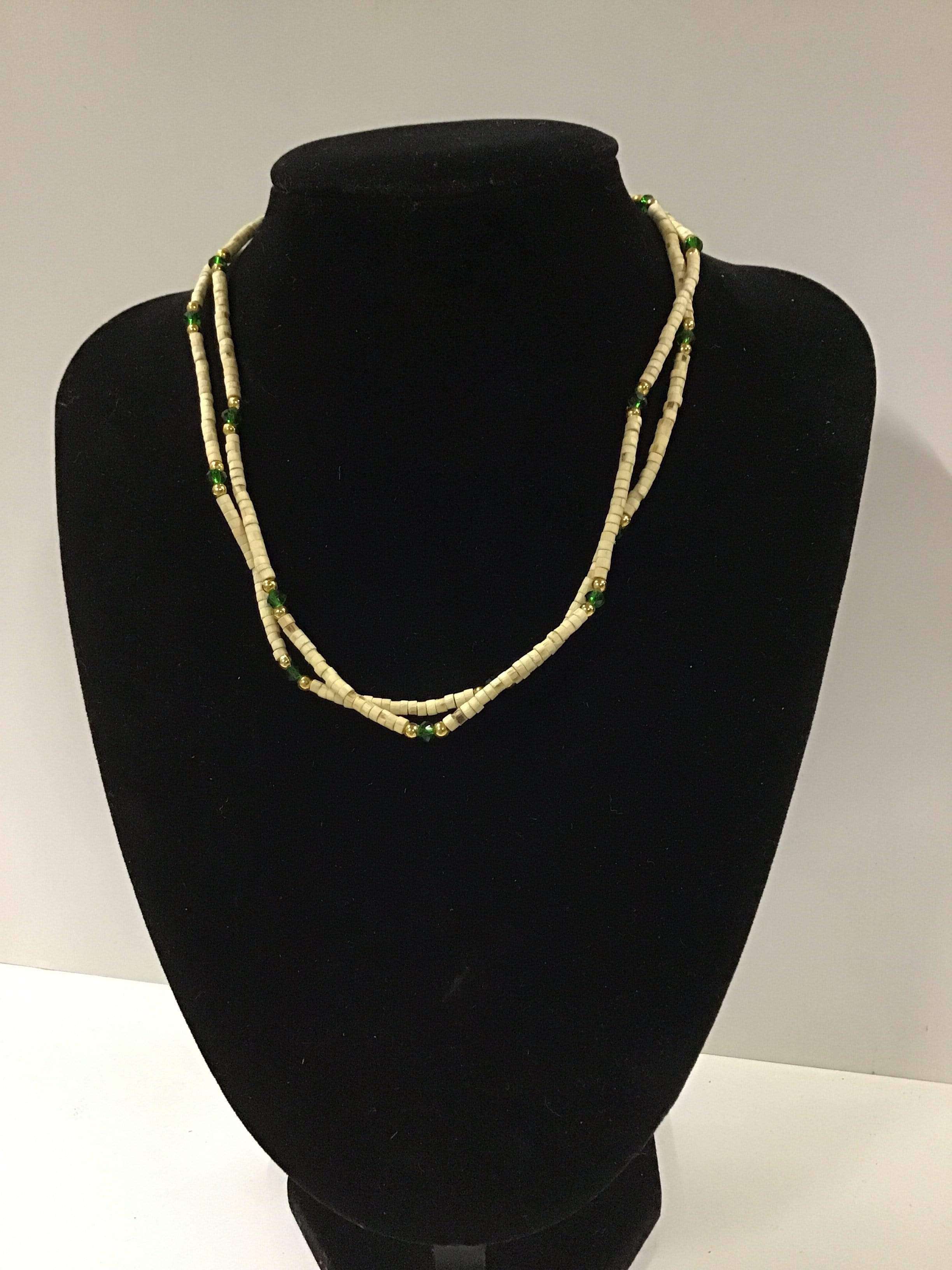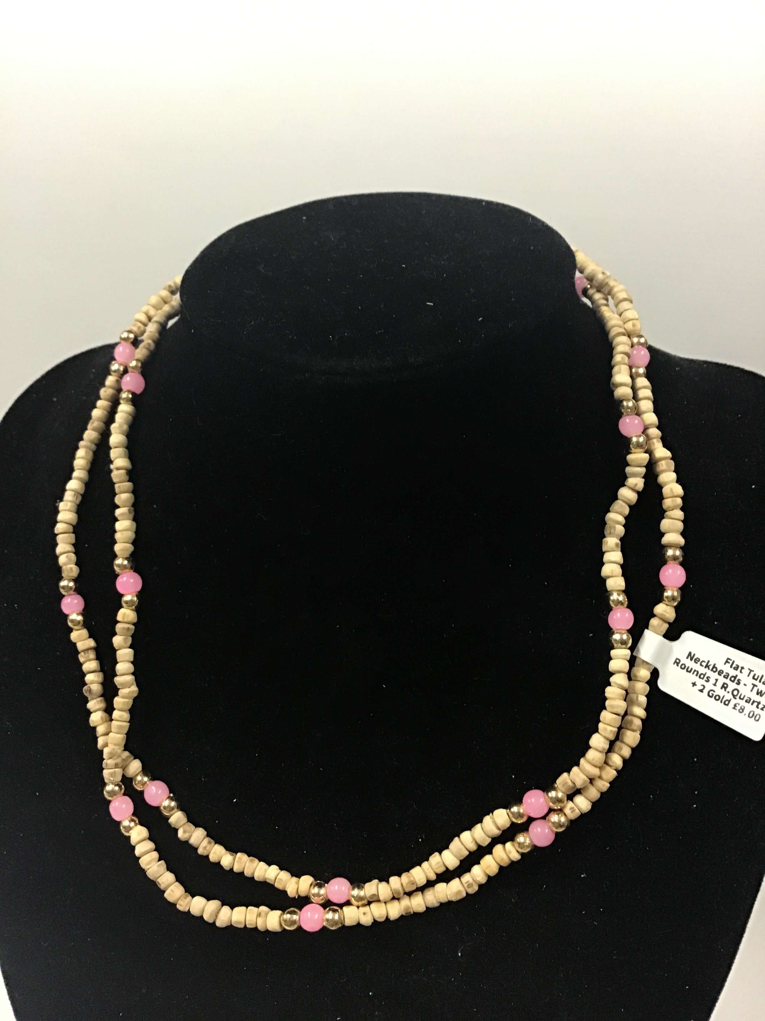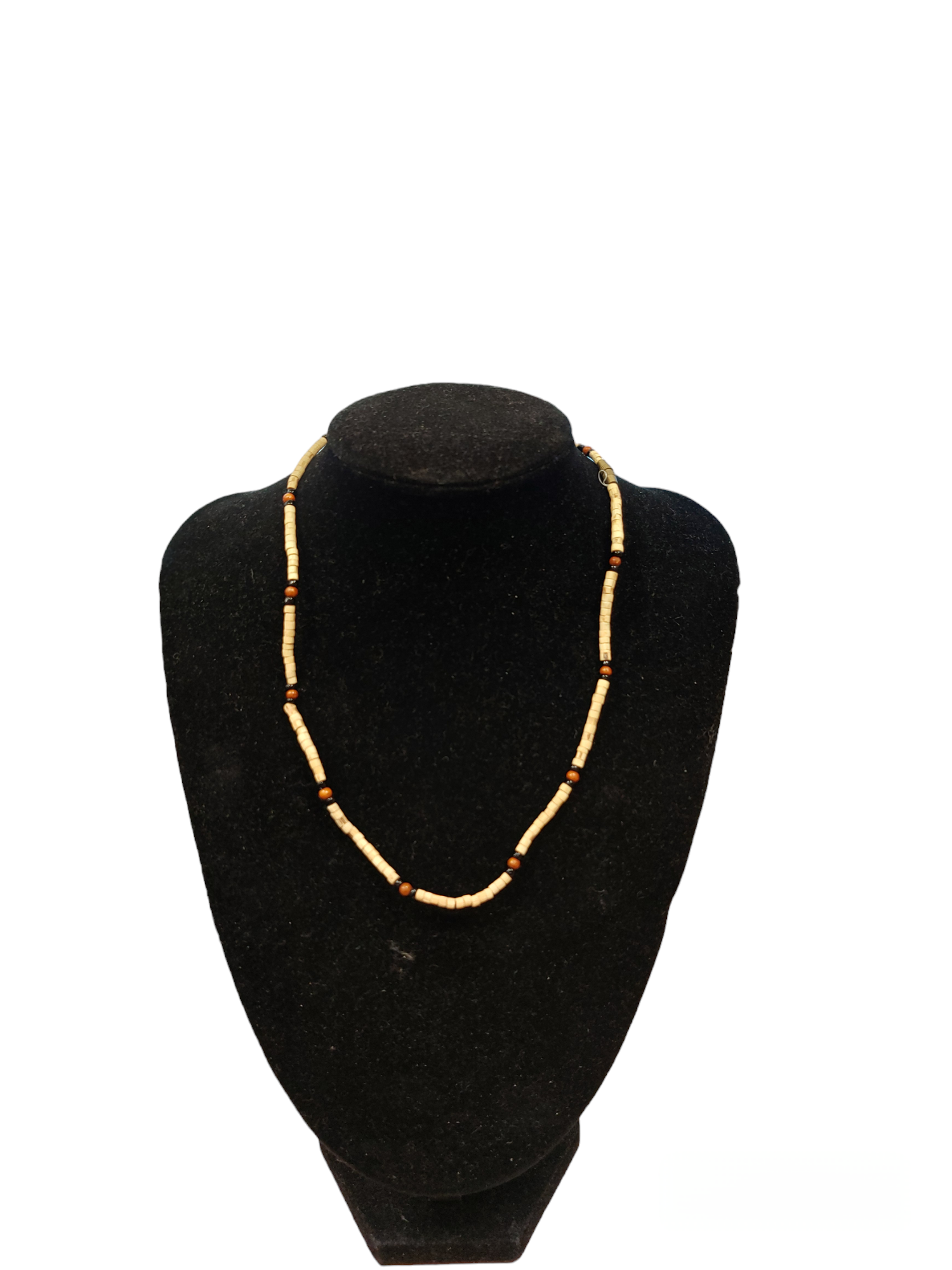 Necklace (kanthi mala) made of 3mm x 2mm Tulasi beads with flat ends. This style comes in plain or with one/three beads of similar size (made of another material) threaded onto the necklace approximately every 5-20 beads, depending on style. The length of the necklace is 18" from end to end when undone.