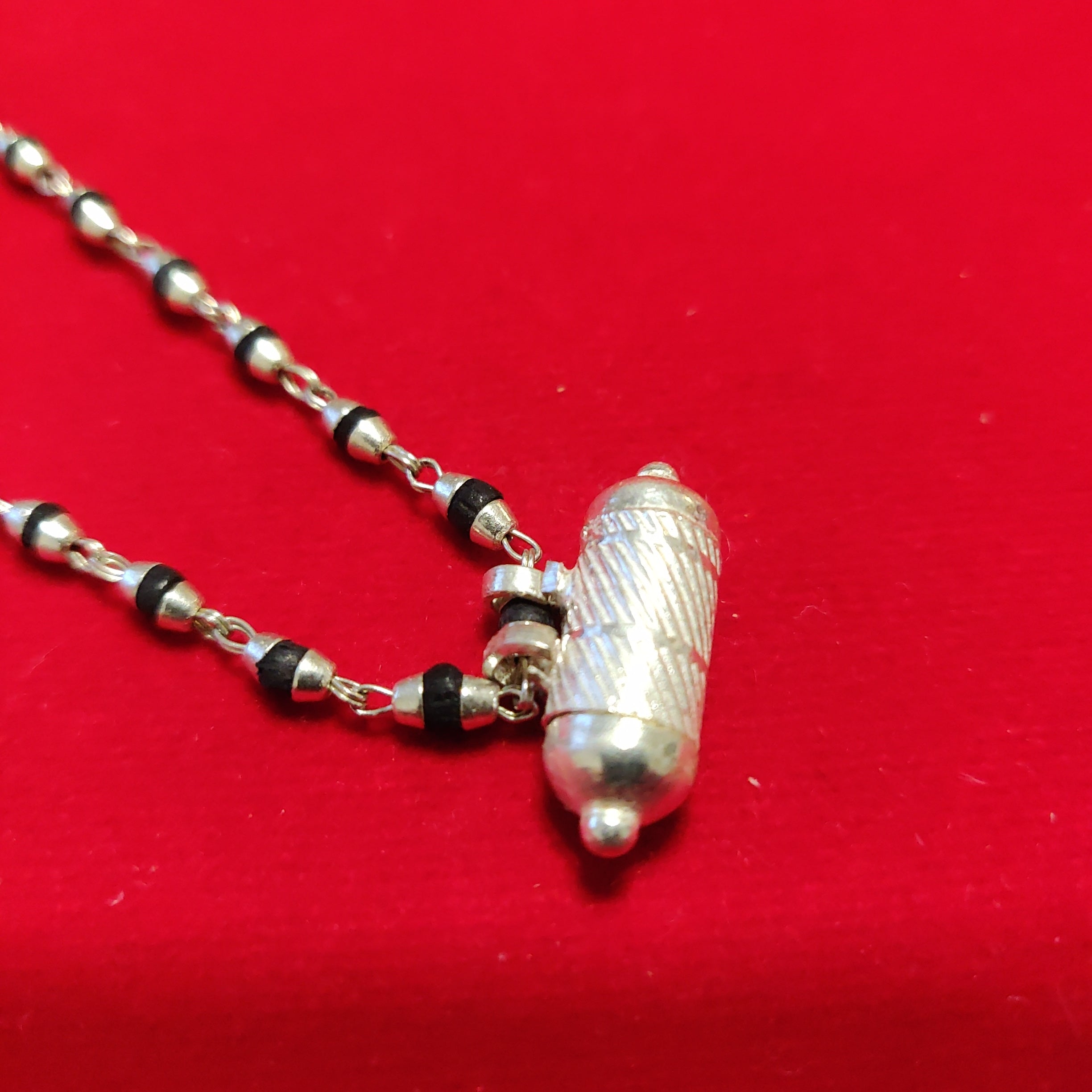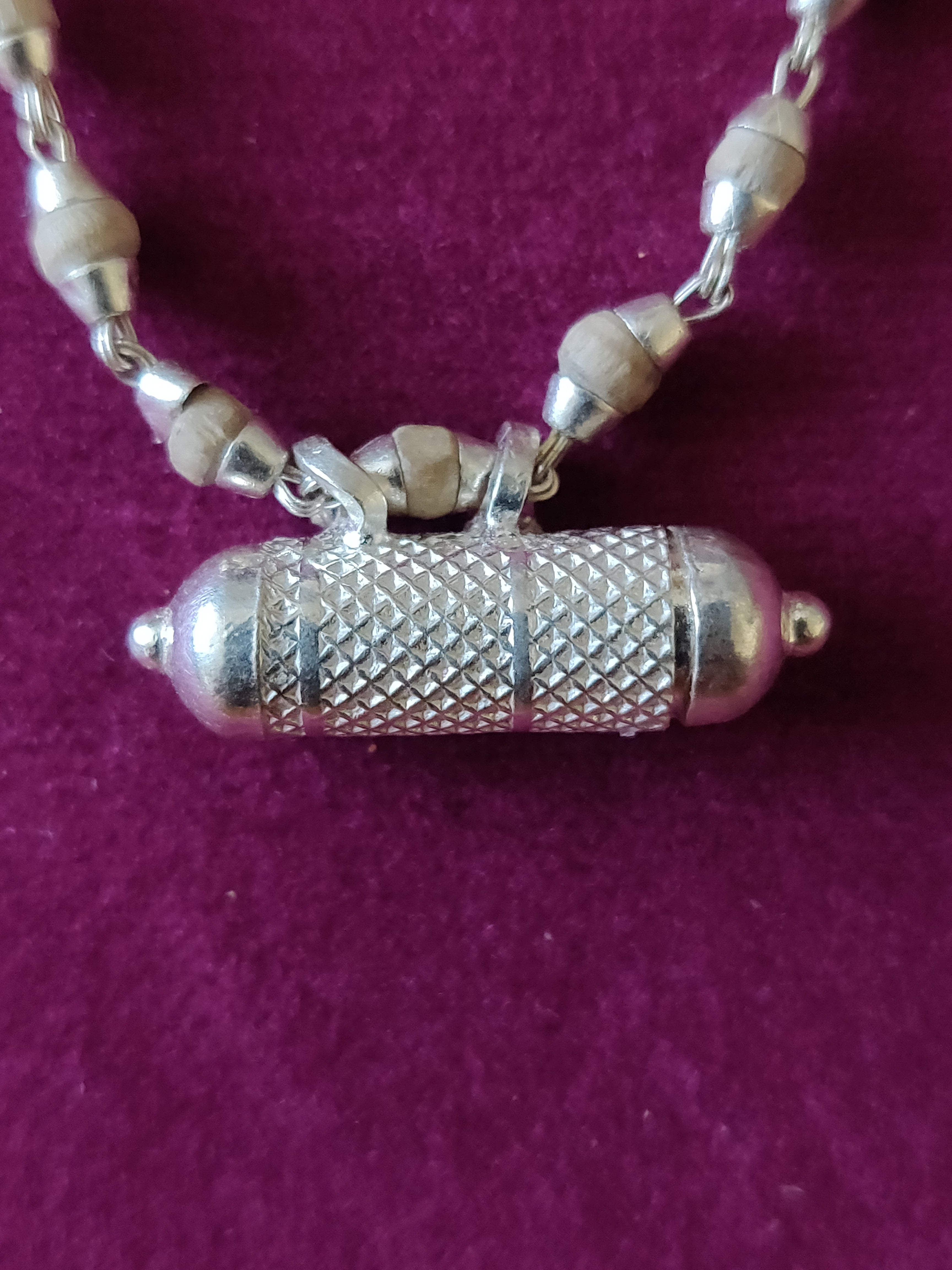Pure Silver Tulasi Neck beads(Natural/Black Tulasi beads) with a Narshima kavach filled with Tulasi leaves, Vrindavan dust and Narshima yantra.