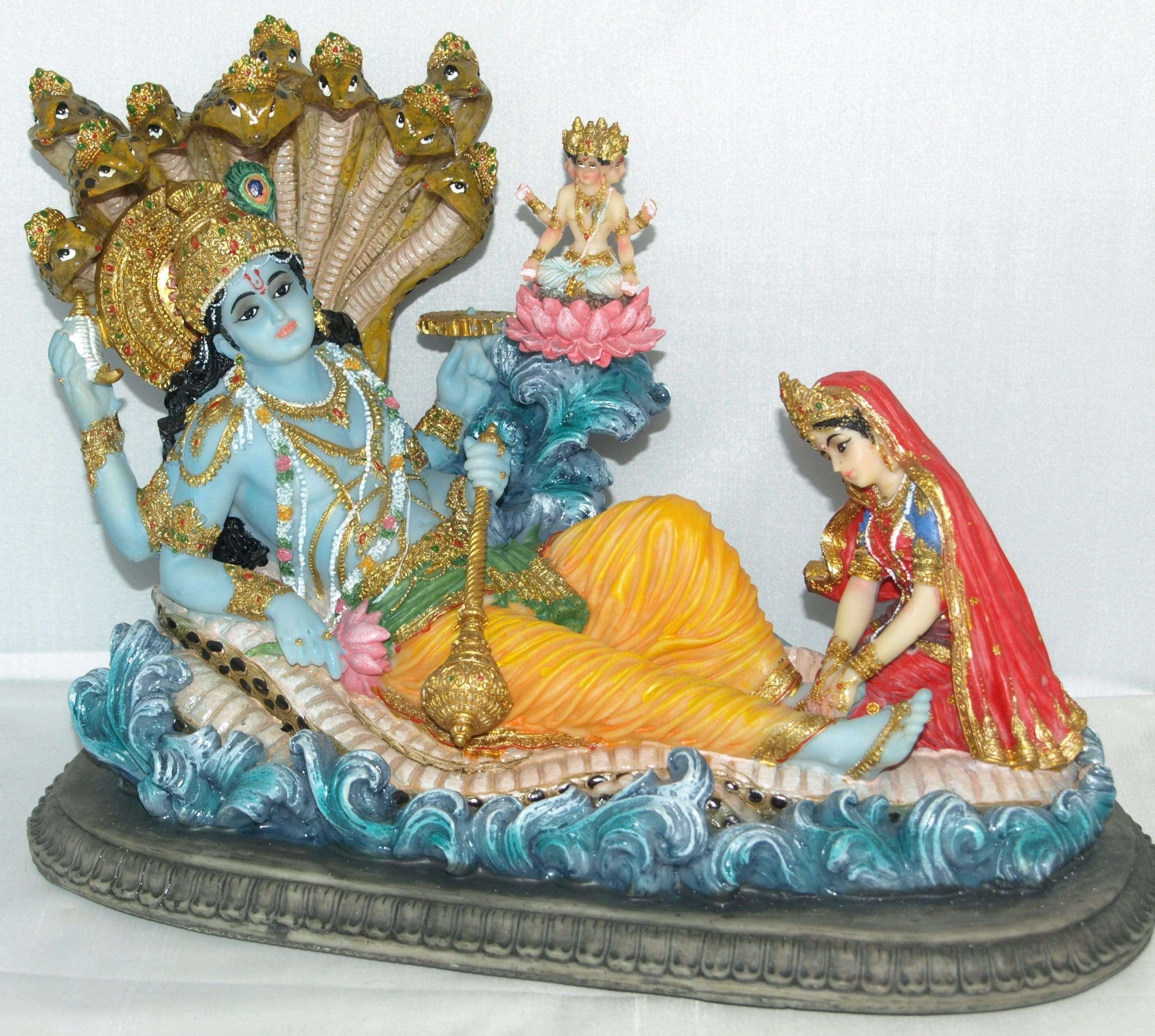 A beautiful hand painted poly-resin figure of Garbhodakashayi Vishnu resting on Ananta Sesa with Mother Lakshmi massaging His lotus feet.
