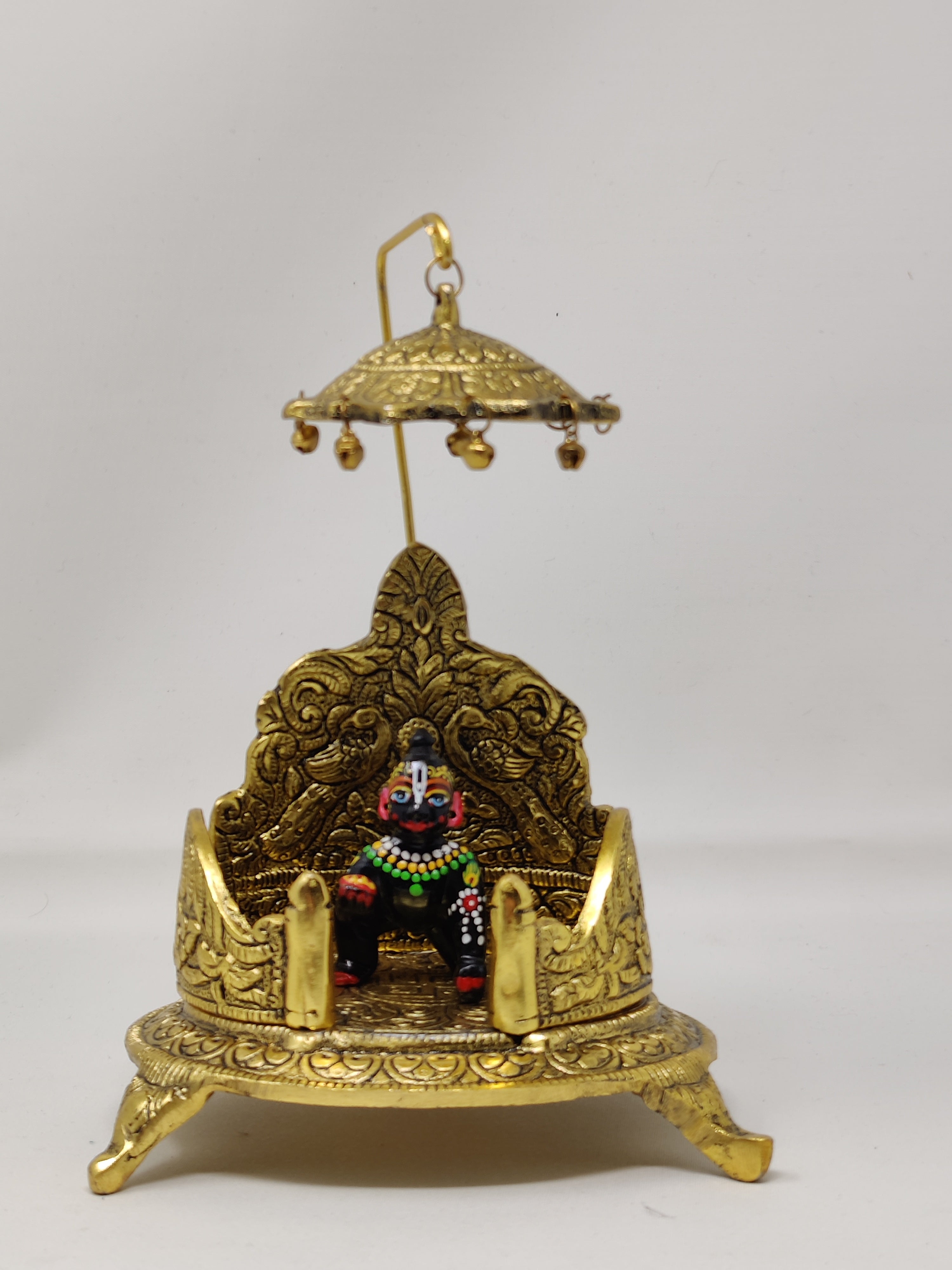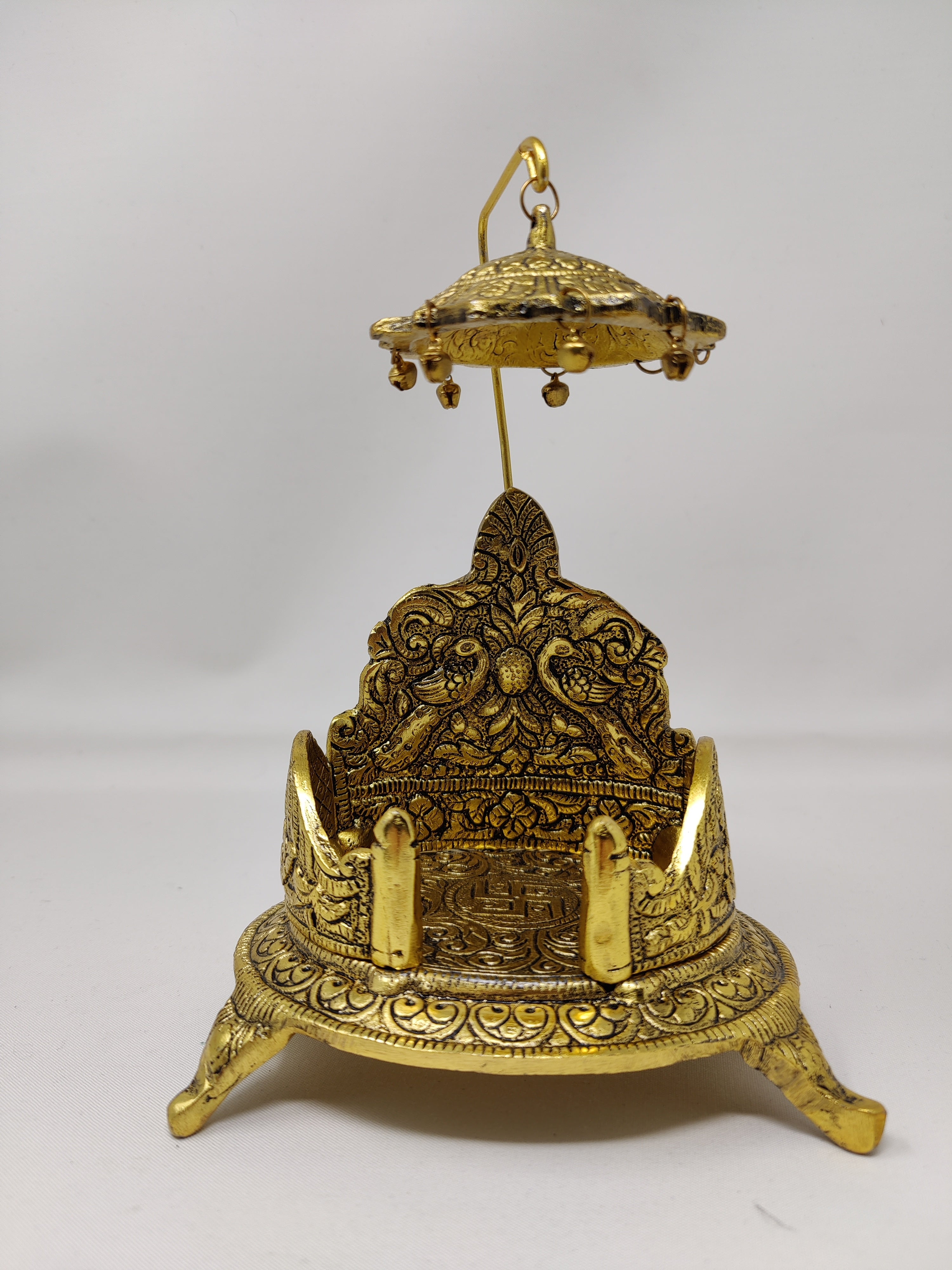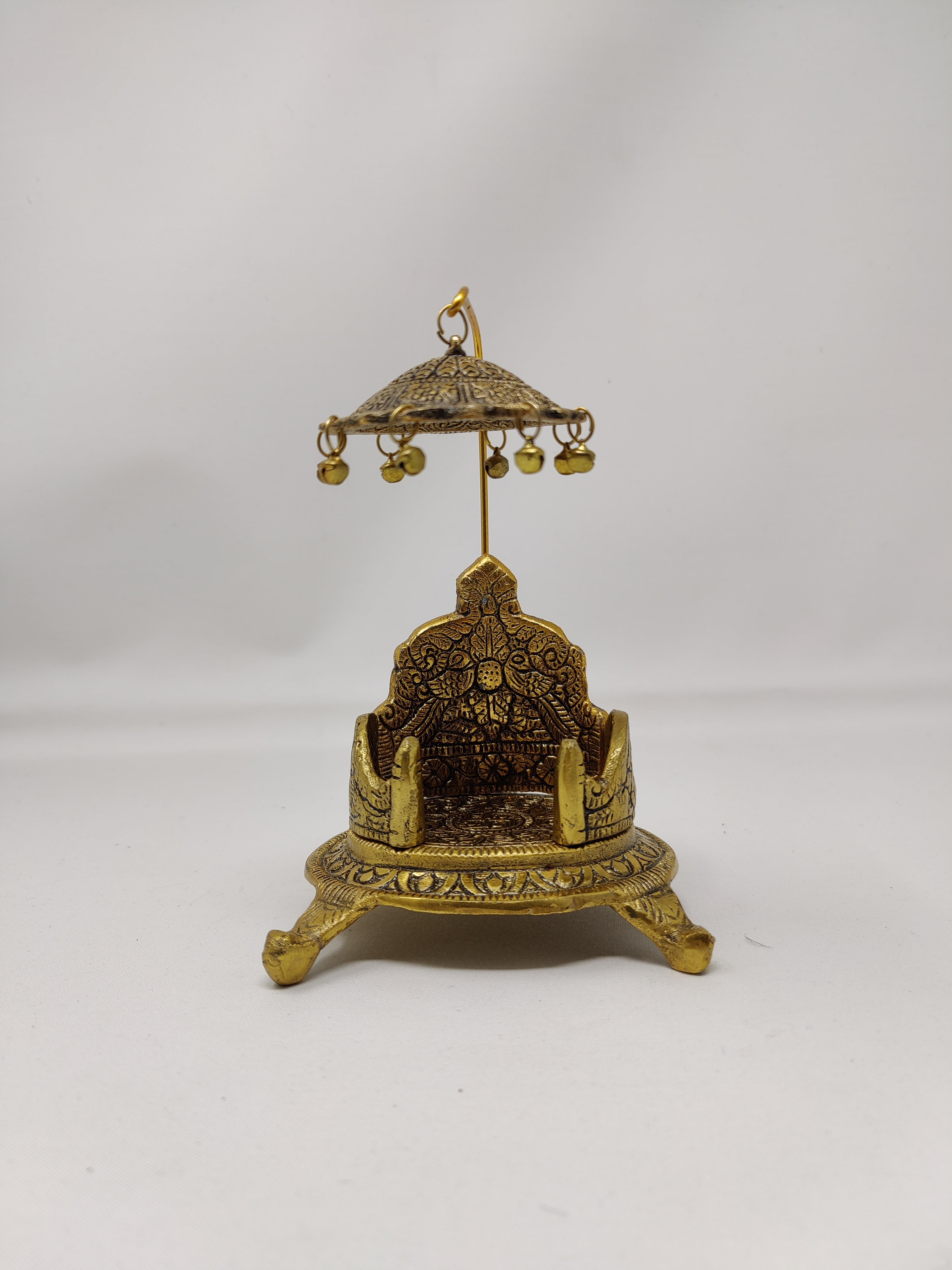 - This beautiful Simhasanam (Singhasan) made in netted metal with gold polished. Deity idols are installed on Simhasanam as a sign of respect and praise. It comes with a detachable umbrella.