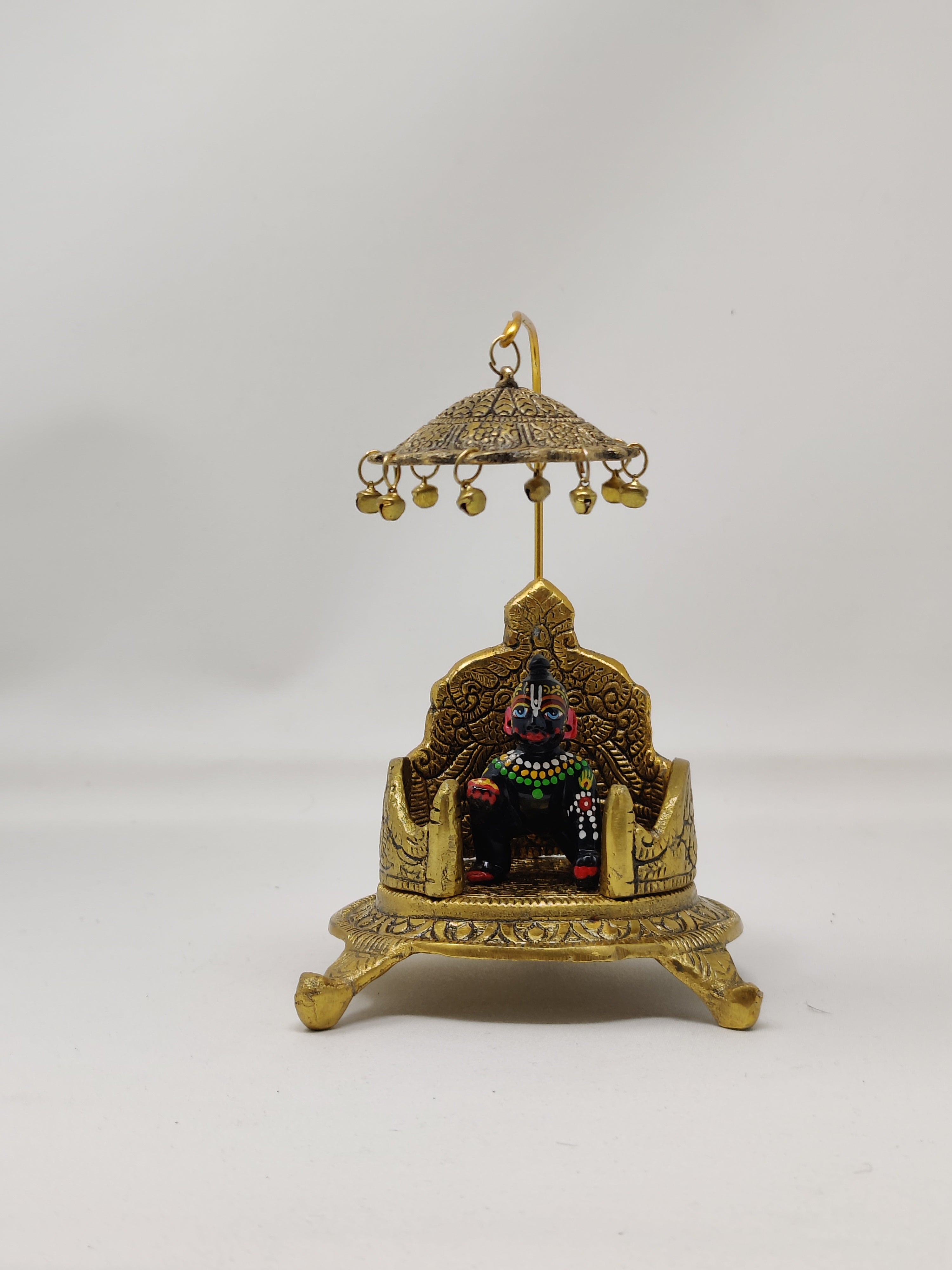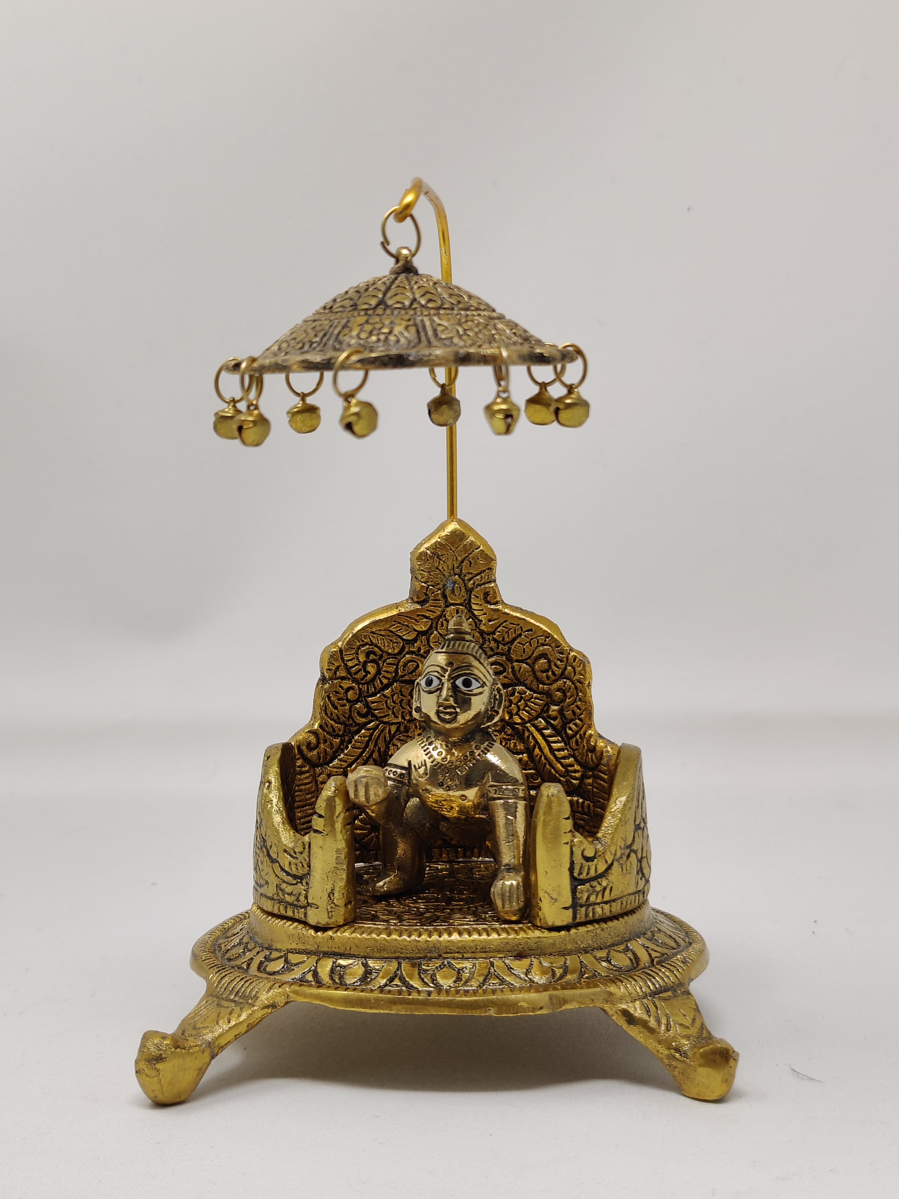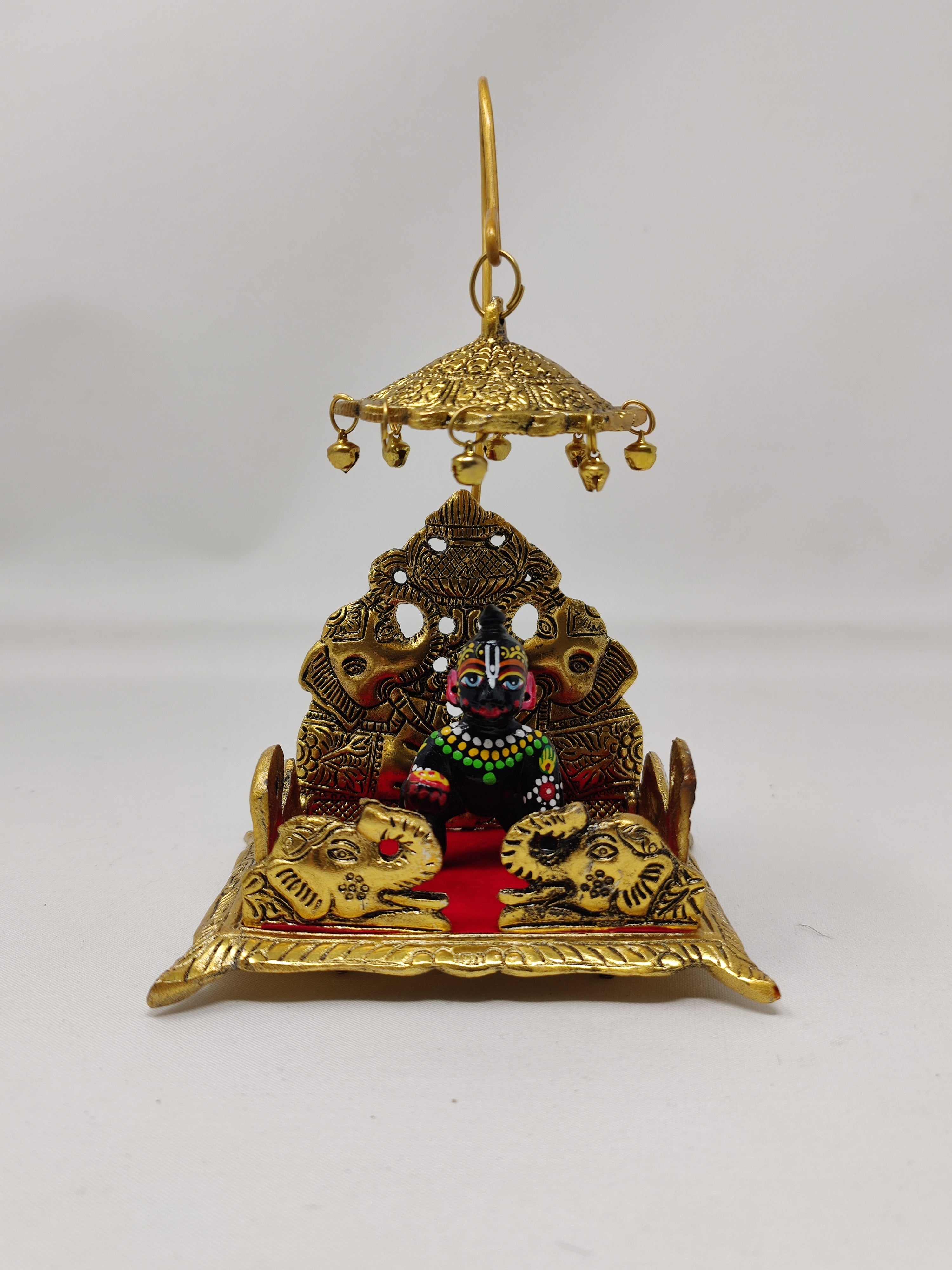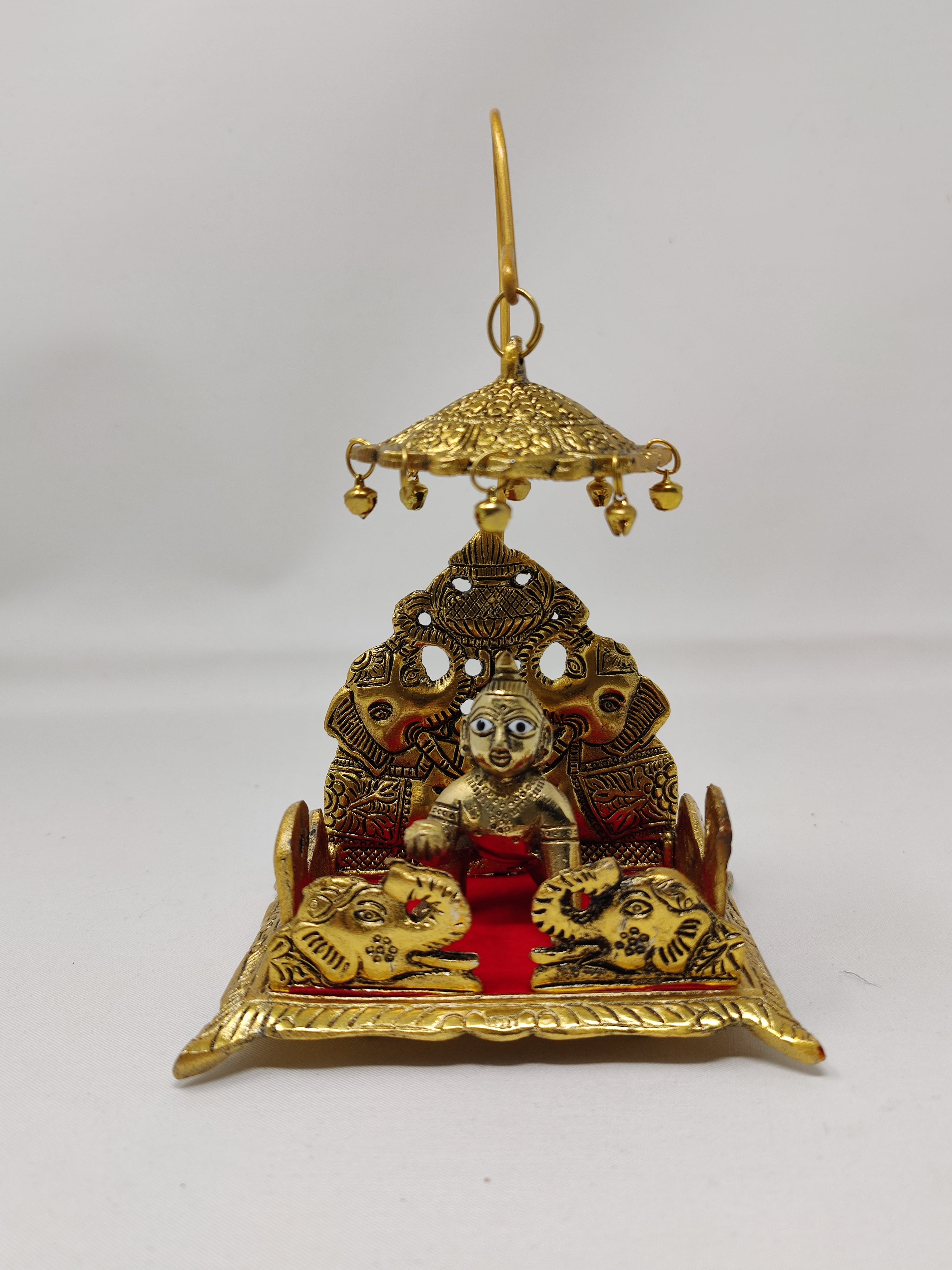 - This beautiful Simhasanam (Singhasan) made in netted metal with gold polished. Deity idols are installed on Simhasanam as a sign of respect and praise. It comes with a detachable umbrella.