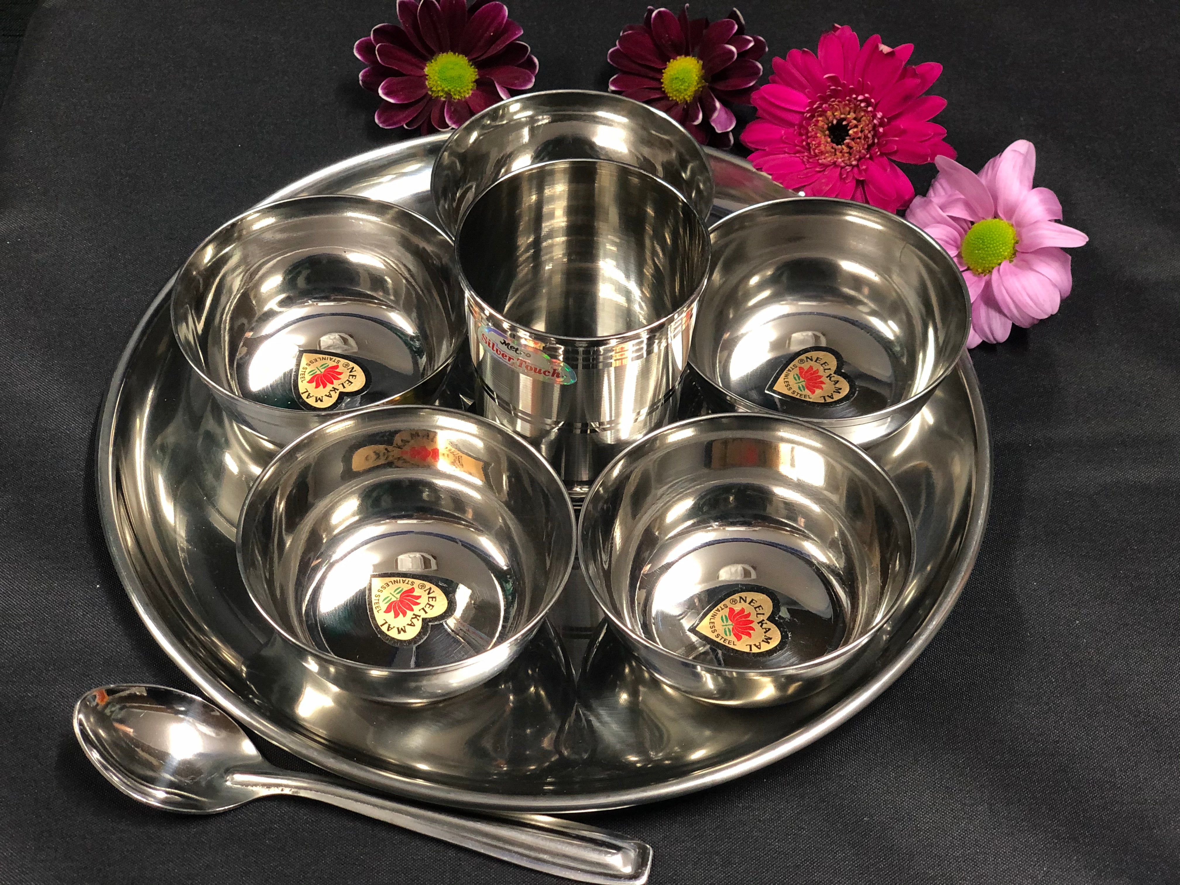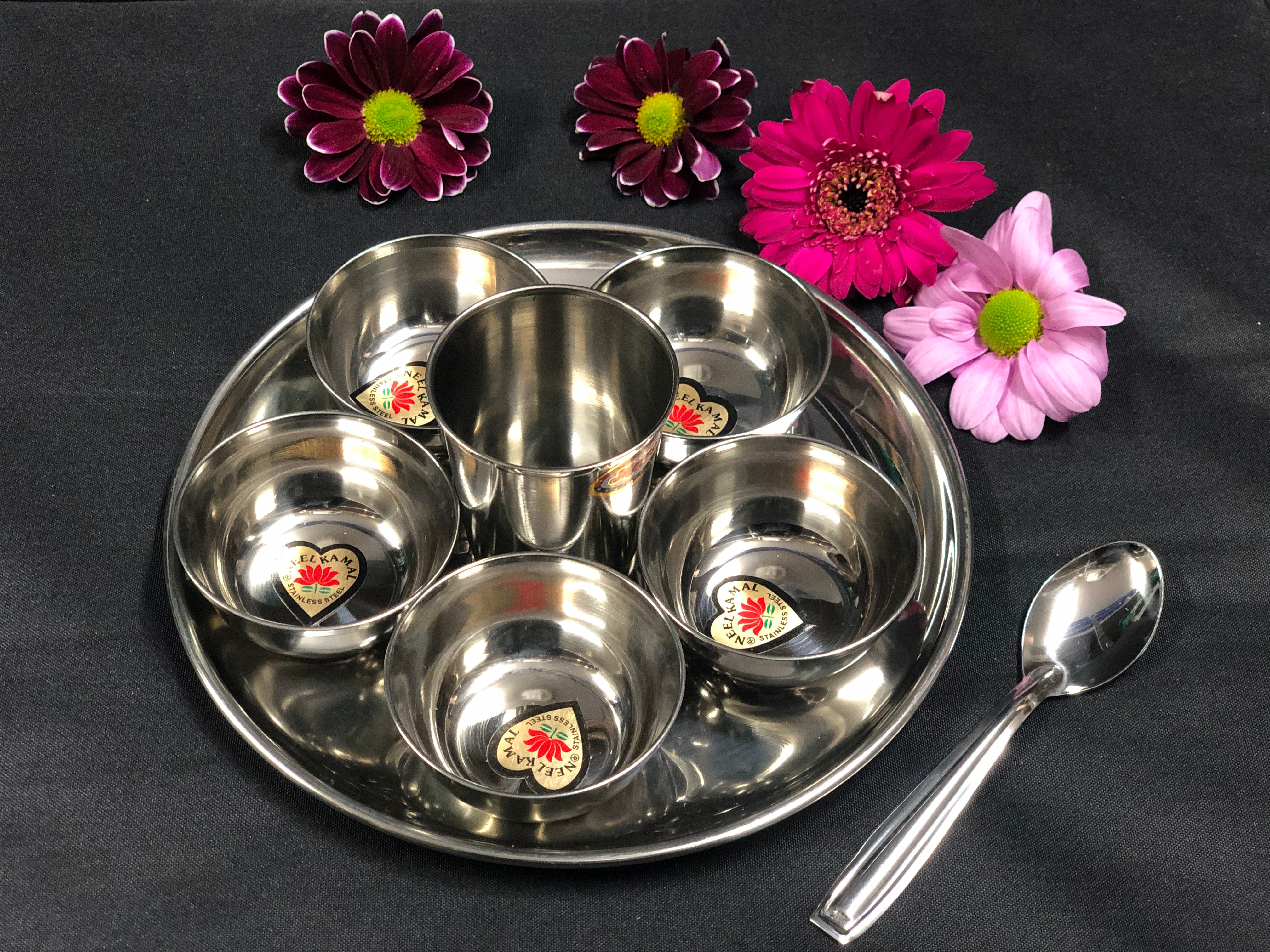 Offering Plate is made from stainless steel and it comes in three different size small, medium and large and each of size comes with 5 bowls, one cup (Glass) and one spoon.