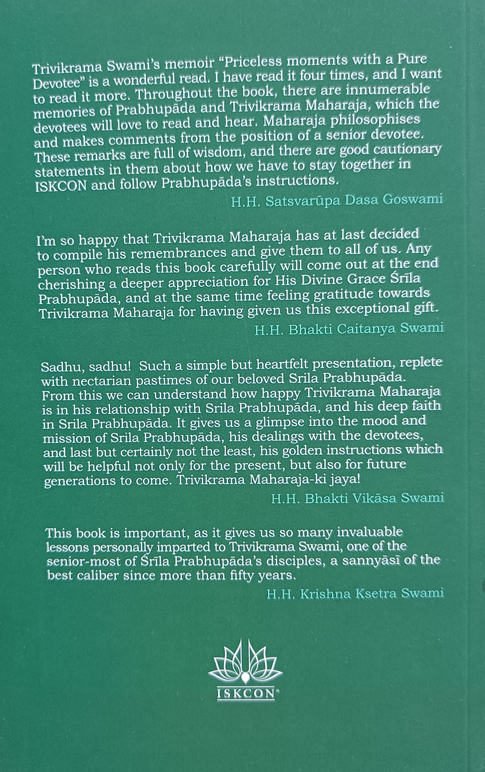 A new memoir filled with very personal and intimate exchanges between Srila Prabhupada and his devotee Trivikrama Swami. Let us absorb our minds in thinking and remembering the activities of a pure devotee, Srila Prabhupada, and get closer to him within our hearts. There is nothing as sublime as this.