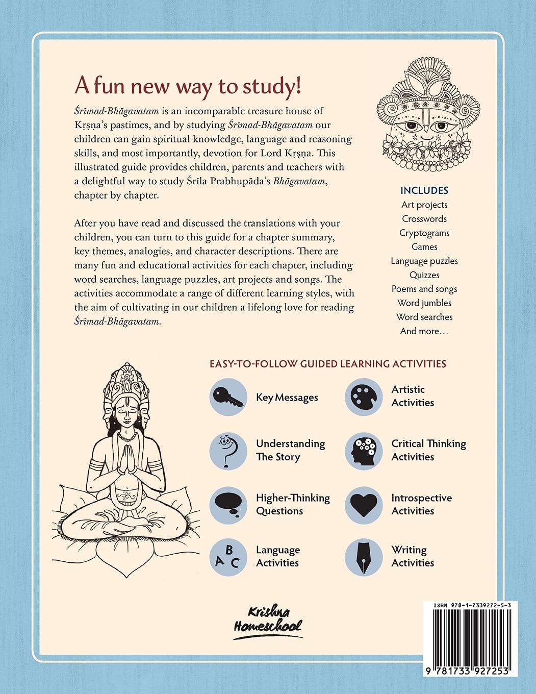 Srimad Bhagavatam is an incomparable treasure house of Krishna's pastimes, and by studying Srimad Bhagavatam our children can gain spiritual knowledge, language and reasoning skills, and most importantly, devotion for Lord Krishna. This guide provides children, parents, and teachers with a delightful way to study Srila Prabhupada's Bhagavatam, chapter by chapter. After you have read and discussed the translations with your children, you can turn to this guide for a chapter summary, key themes, analogies, and character descriptions. There are many fun and educational activities for each chapter, including word searches, language puzzles, art projects and songs. The activities accommodate a range of different learning styles, with the aim of cultivating in our children a lifelong love for reading Srimad Bhagavatam.