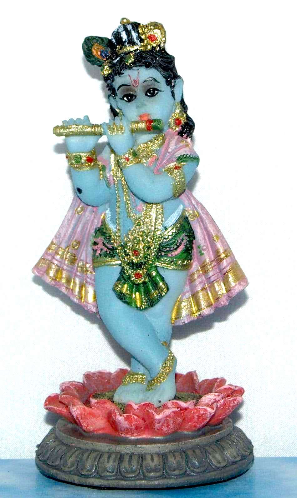 A Beautiful hand painted poly-resin figure of Lord Krishna playing His Flute in the heart of a lotus flower. Height - 127mm Weight - 233 grams
