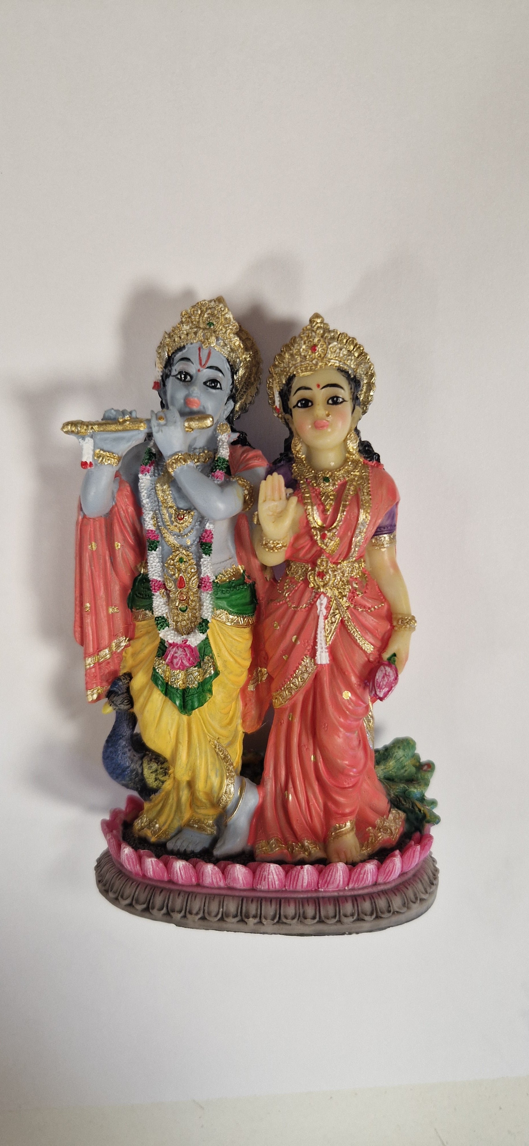 A beautiful hand painted poly-resin figure of the Divine Couple Radha and Krishna stood in the heart of a lotus flower.