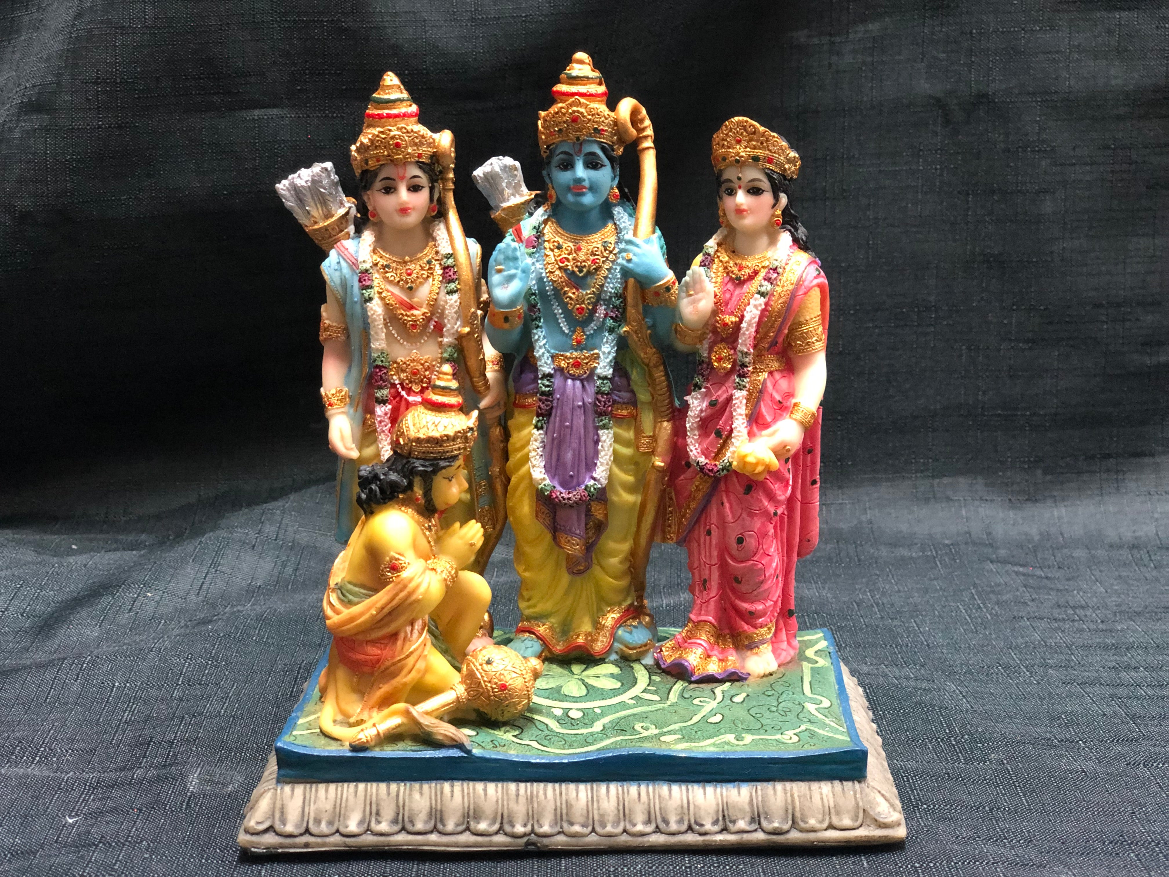 A beautiful hand painted poly-resin figure of The Divine couple Mother Sita & Lord Ramachandra with His brother  Lakshmana and devoted Servant Hanuman.  Height - 215.9 mm Weight - 2174 grams