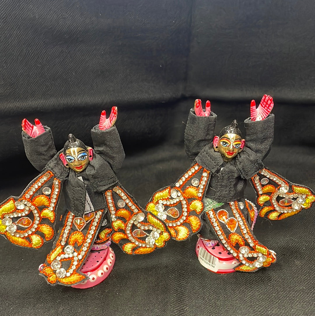 Painted and unpainted brass Deities of Lord Caitanya Mahaprabhu and Lord Nityananda Prabhu with clothes.