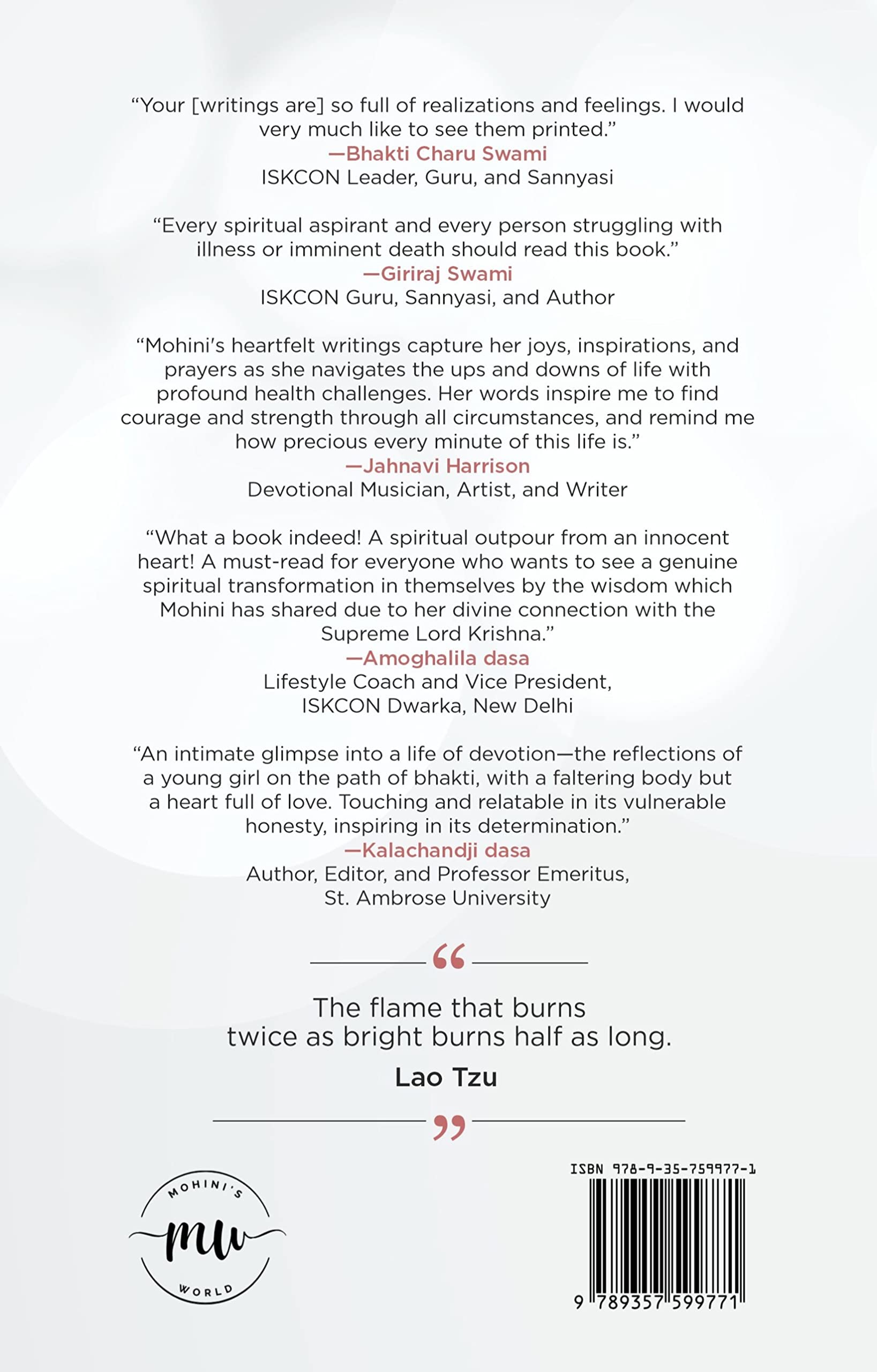 Twice as Bright: A Young Girl’s Journal of Devotion is a collection of a 19-year-old Madana-mohana-mohini dasi’s diaries from September 2019 to October 2020 where she shares day-to-day reflections and realizations from her life. She shares her health struggles living with a neuromuscular condition (Muscular Dystrophy), her desire to serve the Lord and the devotees, and her desire to experience the fullness and goodness of an expectedly short life despite the limitations of her body. The pages of her diary are full of little details from her life. She shares her experiences, learnings, dreams, longings, doubts, thoughts, and imaginations in a real and honest way. The book unfolds her heart’s journey, her introspection through the good and bad, the highs and lows, the strengths and vulnerabilities that she faces regularly. It shows Mohini’s resilience, kindness, enthusiasm, and urgent compassion. One can experience through this book Mohini’s belief in the simplicity and inclusive nature of bhakti, the beauty and magic of prayers and mercy, and the power of love and surrender. The pages show her gratitude towards and acceptance of Krishna’s plans. In many places, you will find her being too hard upon herself because she feels a strong urge to serve and preach and make her life meaningful, her actions purposeful, and her contribution valuable for Srila Prabhupada’s movement—our movement. Her words, “Devotional service is our life,” and “Let life be a part of your service—not service a part of your life,” express that well. She often reflects on the struggles of a sadhaka, and the plight of the world, and ends the book with an urgent prayer to all the devotees to take up responsibility to preach, quoting John E. Lewis, “If not us, then who? If not now, then when?”